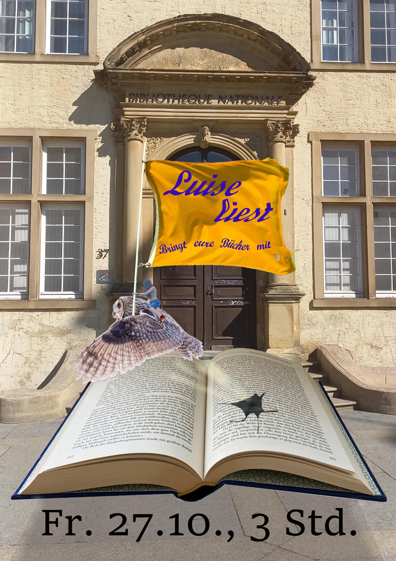Luise liest: Wir freuen uns auf unsere gemütliche Lesestunde am Donnerstag in der 5. Stunde. Damit auch wirklich die ganze Schule in Ruhe lesen kann, bringt euch bitte wieder Bücher von zu Hause mit.