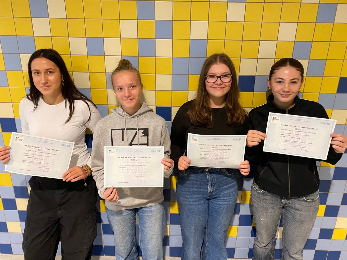 Im letzten Halbjahr 22/23 hat sich eine kleine, aber feine Gruppe im Rahmen einer Delf-AG wöchentlich getroffen, um die Delf-Prüfung (Niveau A2) vorzubereiten. Alle vier Schülerinnen haben mit hervorragenden Ergebnissen die Prüfung bestanden und einmal mehr erlebt, wie man die französische Sprache in Alltagszusammenhängen mündlich und schriftlich erfolgreich anwenden kann.