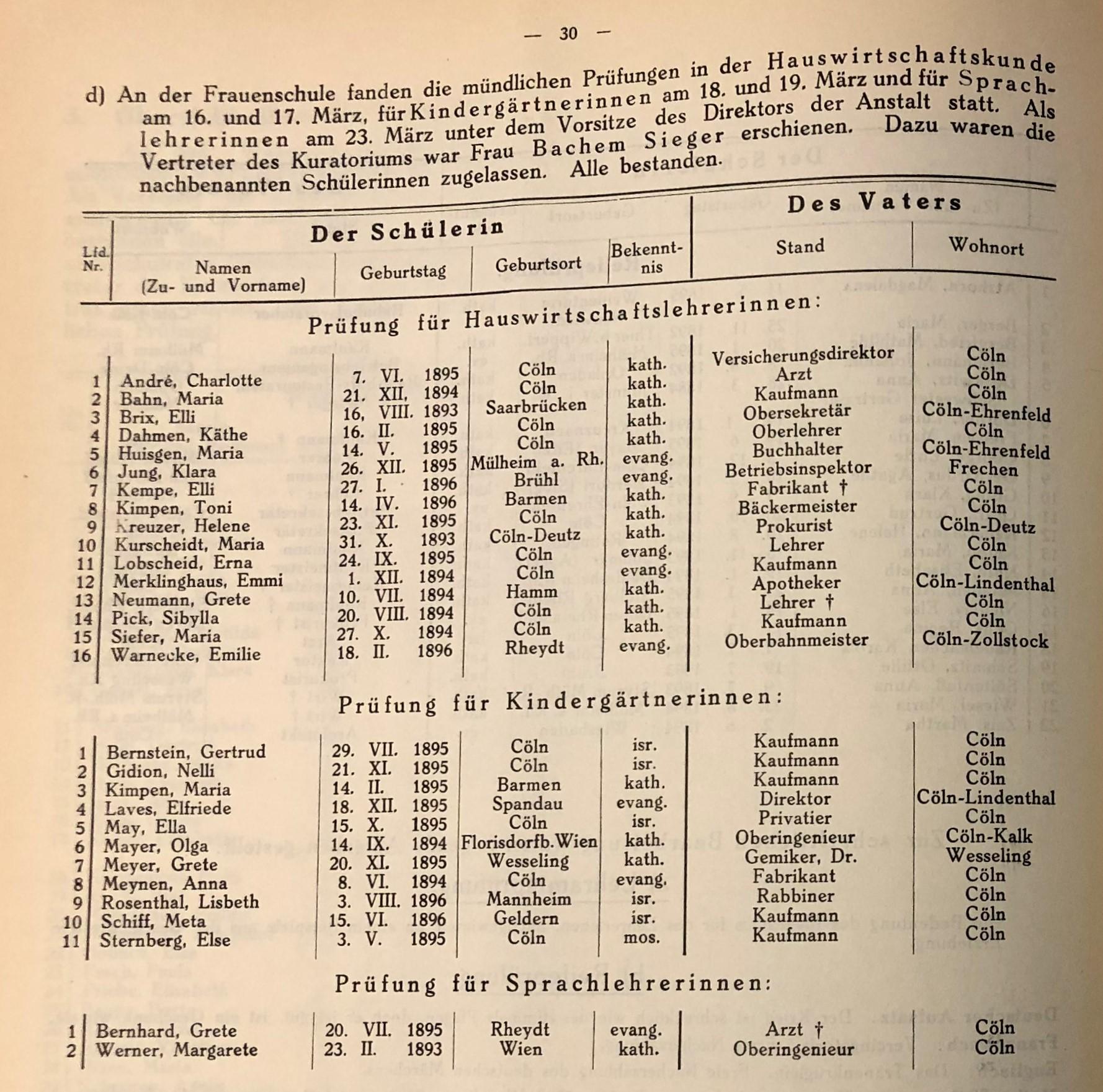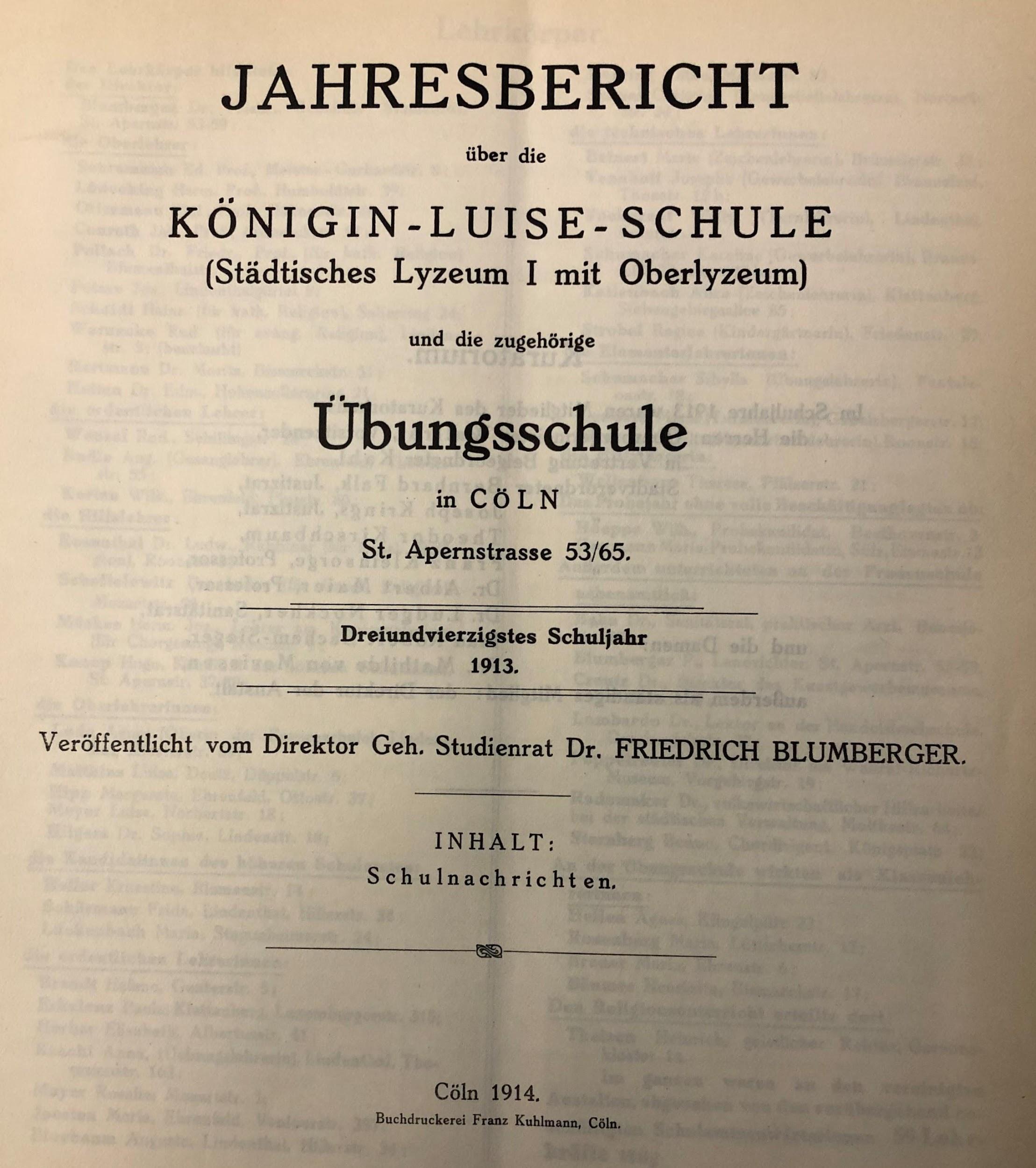 Meine Recherche begann mit einem einzigen Dokument: dem Jahresbericht der Königin-Luise-Schule von 1913. Dieses verriet mir Gertruds Namen, ihr Geburtsdatum, ihren Geburtsort, ihre Konfession und den Stand ihres Vaters. Diese Eckdaten sind erstmal recht spärlich und sagen wenig über Gertruds Leben aus. Trotzdem bilden sie die Grundlage meines Rechercheprozesses, weil es mir auf Basis dieser Informationen gelungen ist, immer mehr über Gertrud herauszufinden und ihr Leben Stück für Stück zu rekonstruieren.