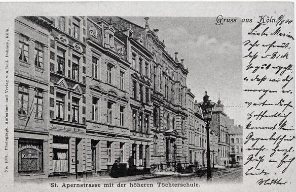 Wie bereits erwähnt, genießt Gertrud eine „höhere“ schulische Ausbildung. Damals sind Schulen für Jungen und Mädchen strikt voneinander getrennt und es wird zwischen “Höheren Knabenanstalten” und “Höheren Töchterschulen” unterschieden. Lange gibt es nur private Schulen für Mädchen und erst im Jahr der Reichsgründung 1871 wird die erste städtische und damit konfessionell unabhängige Höhere Töchterschule Kölns gegründet - die heutige Königin-Luise-Schule. Diese wird allerdings erst 1907 auf diesen Namen getauft, als es eine zweite städtische Höhere Töchterschule in Köln gibt.