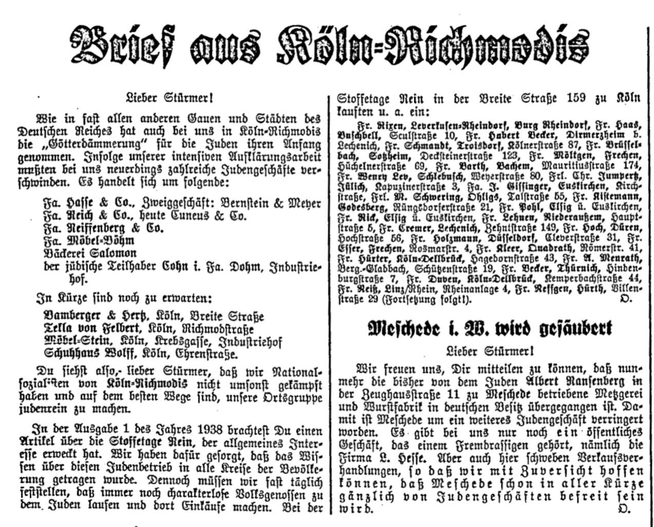 “Lieber Stürmer! Wie in fast allen anderen Gauen und Städten des Deutschen Reiches hat auch bei uns in Köln-Richmodis die “Götterdämmerung” für die Juden ihren Anfang genommen. Infolge unserer intensiven Aufklärungsarbeit mußten bei uns neuerdings zahlreiche Judengeschäfte verschwinden. Es handelt sich um folgende: