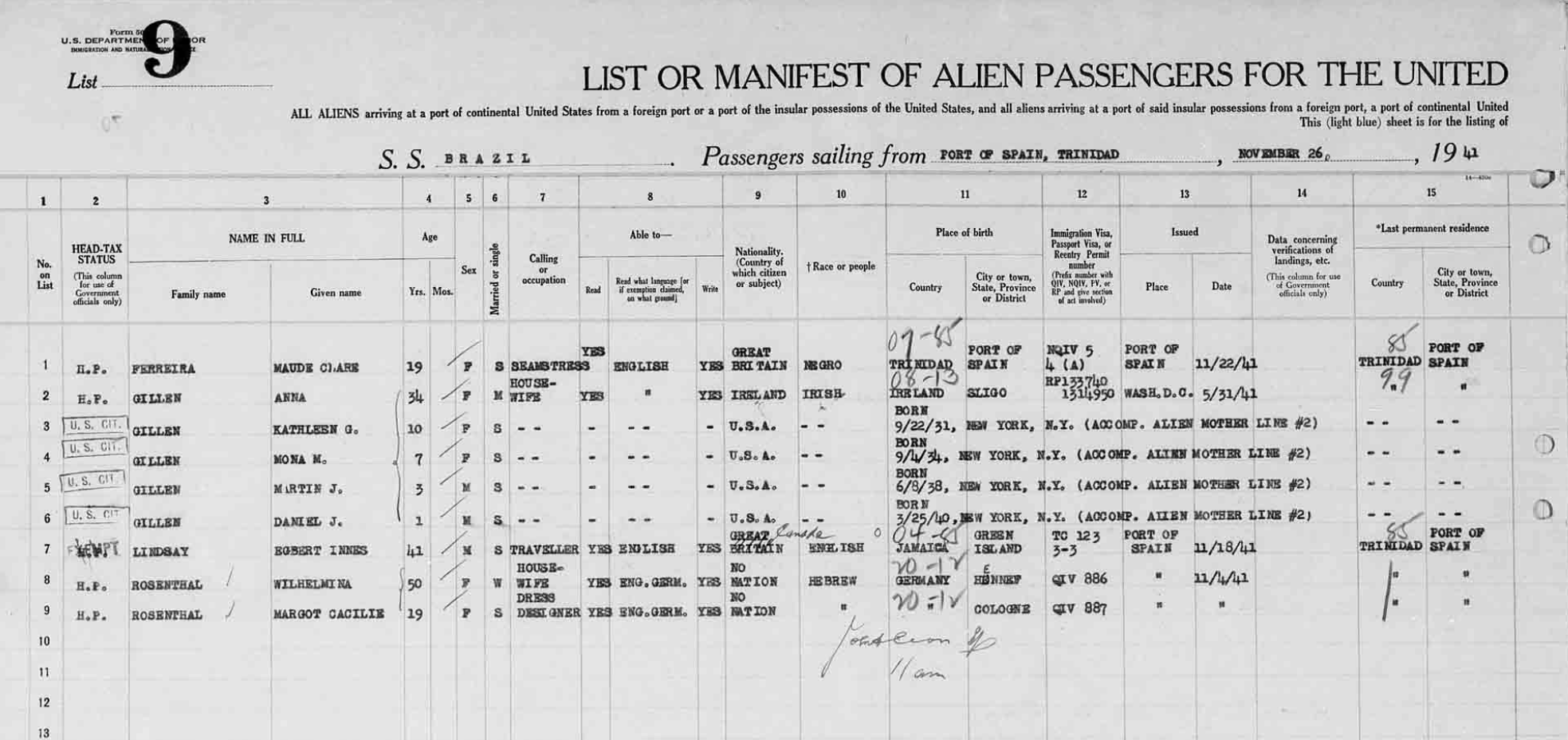 Zwar folgten Margot und Wilhelmine Alfred nach dessen Aussagen schon 4 bis 5 Monate später nach Austin, laut Passagierlisten kamen sie allerdings erst nach etwa zwei Jahren, am 26.11.1941, an Bord des Schiffes „Brazil“ in New York (Ellis Island) an, was sich als verlässlichere Quelle bezeichnen lässt. Aus Margots Berufsbezeichung in den späteren Einreisedokumenten nach Amerika geht hervor, dass sie in Trinidad als „Dress Designer“ (Schneiderin/Mode-Designerin) gearbeitet hat.