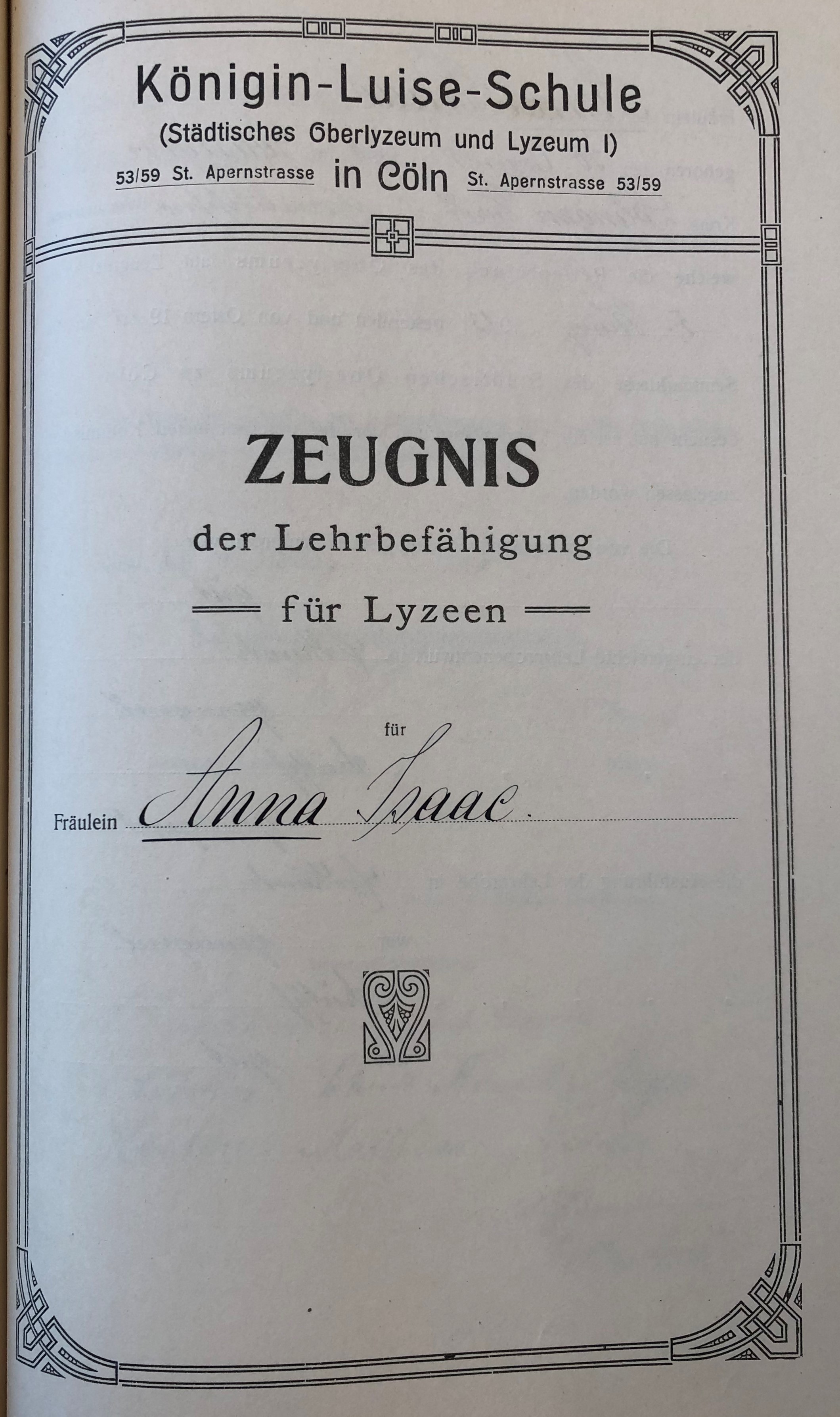 Kurz nach Annas Examen brach im August 1914 der Erste Weltkrieg aus. Wie sie diese Jahre verbrachte – ob sie tatsächlich als Lehrerin arbeitete oder sich wie viele andere Frauen gerade auch aus jüdischen Familien sozial oder karitativ engagierte, vielleicht sogar als Krankenschwester tätig war – wissen wir nicht. Sollte sie die Lehrerinnenprüfung an der KLS ursprünglich mit klarer beruflicher Absicht abgelegt haben, verlief ihr Lebensweg dann aber doch anders.