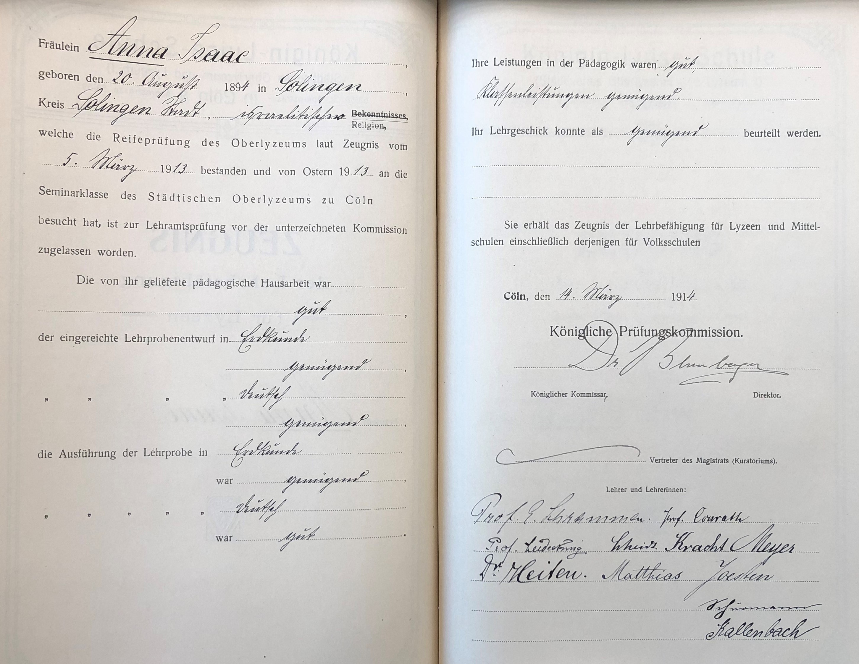 Von Solingen bestand eine direkte Zugverbindung nach Köln, es wäre also vielleicht umständlich, aber möglich gewesen, jeden Tag nach Köln zu fahren. Anna war aber wohl keine „Fahrschülerin“, denn sie war zwischen 1910 und 1914, also genau für den Zeitraum der Ausbildung, in Köln gemeldet. Ob sie in einem Pensionat wohnte oder angesichts ihres Alters doch eher über geschäftliche oder verwandtschaftliche Kontakte in einer Gastfamilie lebte, wissen wir nicht.