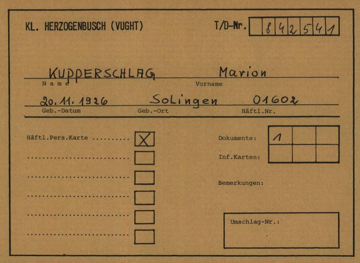 Anna und Josef blieben dagegen vorerst in Solingen, Josef versuchte als Handelsvertreter die Familie zu versorgen. Bald jedoch mussten Kupperschlags zu Annas Schwiegereltern in eine kleinere Wohnung in der Klemens-Horn Straße 15 umziehen. Auch die beiden Töchter Ruth und Marion bekamen die immer schärferen Diskriminierungen zu spüren: 1938 mussten sie das Lyzeum verlassen, das sie in Solingen besuchten. Und die gesamte Familie wurde direkt Opfer der „Reichspogromnacht“ – in der Nacht vom 9. November 1938 verwüstete ein entfesselter Mob die Wohnung der Kupperschlags und zerschlug den gesamten Hausrat.