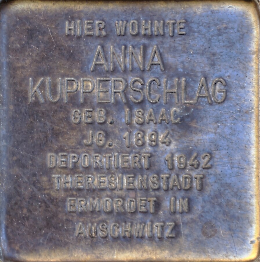 Am 19. Oktober 2023 werden wir einen Stolperstein vor der Königin-Luise-Schule verlegen lassen, zum Gedenken an unsere ehemalige Mitschülerin Anna Kupperschlag (geb. Isaac). An sie und ihre Familie werden wir überdies im Gedenkbuch auf der Homepage der Schule erinnern.