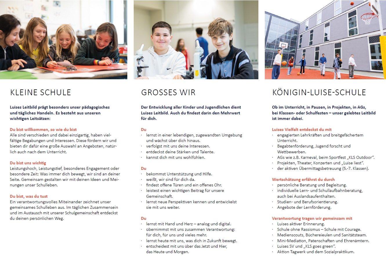 Luises treibende Kraft ist die Vielfalt, die Verantwortung und die gegenseitige Wertschätzung unserer Schüler:innen, Eltern und Lehrkräfte. Was unser Schulleben besonders ausmacht und gut beschreibt, zeigt Luises Leitbild.