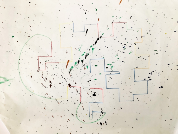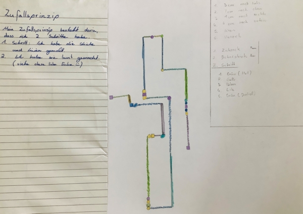 Auch die 6b hat sich im Kunstunterricht - angeregt durch ähnliche Fragen - mit aleatorischen Verfahren beschäftigt. Aufgabe war es, ein Konzept für ein Zufallsbild zu entwickeln und dieses anschließend auszuführen. Die meisten Kinder entwickelten Ideen, bei denen Würfel oder Münzen zum Einsatz kommen sollten; sie haben festgelegt, was bei welchen Ergebnissen auf dem Blatt für Bewegungen in welchen Farben ausgeführt oder welche Formen jeweils zum Einsatz kommen sollten. Geschult wurde so ein ansatzweise konzeptuelles Denken, das für die zeitgenössische Kunst und auch für die Informatik von großer Bedeutung ist. Herausgekommen sind Bilder, die vielleicht etwas technisch aussehen, aber dennoch ästhetisch interessant sind. (De)