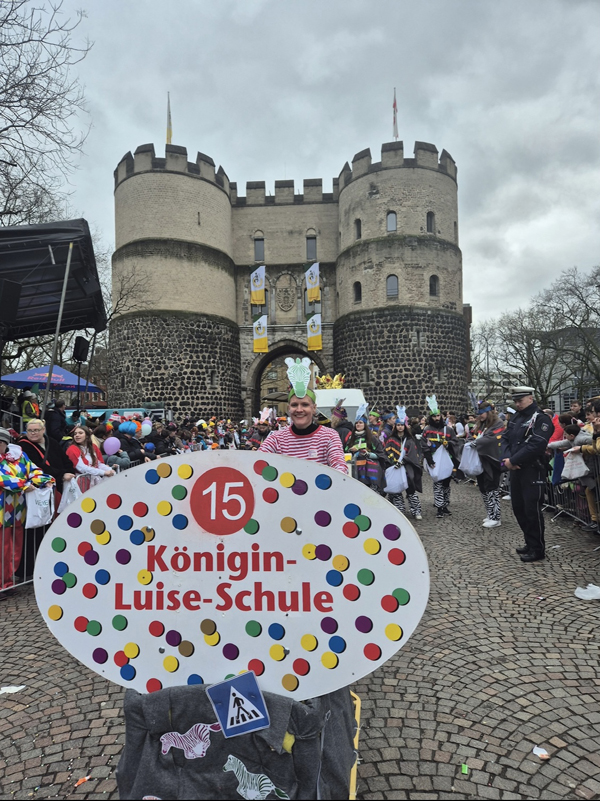 Der Höhepunkt des karnevalistischen Treibens an der KLS ist unbestritten jedes Jahr die Teilnahme an den Schull- und Veedelszöch. Wochenlang wird vorher samstags an den Kostümen gebastelt, werden hunderte Kammellebüggel gepackt und wird vom Orga-Team unter der Leitung von Herrn Körner und Herrn Riddermann alles bis ins kleinste Detail geplant. Und so konnten vergangenen Sonntag 60 aufgeregte und gespannte Teilnehmerinnen und Teilnehmer in der Nähe des Chlodwigplatzes auf den Start um 11.11 Uhr warten.