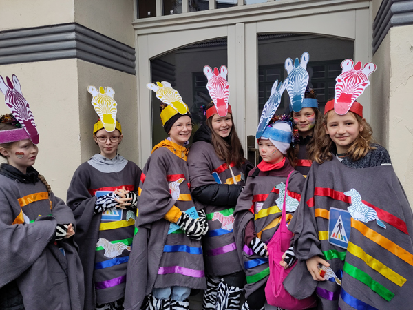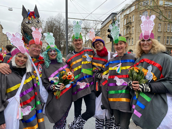 Das Wetter hielt, die Stimmung bei den Jecken am Rand und in unserer Gruppe war bestens und so bedeuteten die knapp vier Stunden Zugweg jede Menge Spaß und Freude. Und auch wenn wir hinterher etwas abgekämpft und mit müden Beinen zur After Zoch-Party im PZ der Schule zusammenkamen, war sofort allen klar: Nächstes Jahr unbedingt wieder. Schöneres Brauchtum und Gemeinschaftsgefühl für Lernende, Kollegium und Elternschaft gibt es nicht.