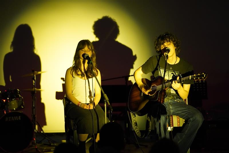 Die Bühne war wie ein Wohnzimmer gestaltet mit einem Teppich, Barhockern und einer kleinen Lampe, unter der unsere Mitschüler:innen ihre Texte vortrugen. Während vorne gesungen und musiziert wurde, sorgte die gemütliche Atmosphäre für einen ganz besonderen Abend.