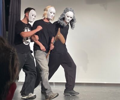 Begonnen haben wir im August 2023 unter der Leitung von Frau Walser mit einer Gruppe von 30 Leuten und so gut wie keiner Spielerfahrung. Aufwärmübungen für Stimme, Konzentration und Interaktion haben den Anfang gemacht. Impulse weitergeben, Geräusche durch den Raum werfen und der sogenannte „Theaterstand“ (schulterbreiter Stand, locker in den Knien, die Arme neben dem Körper hängend) haben uns bereits ab den ersten Wochen begleitet.