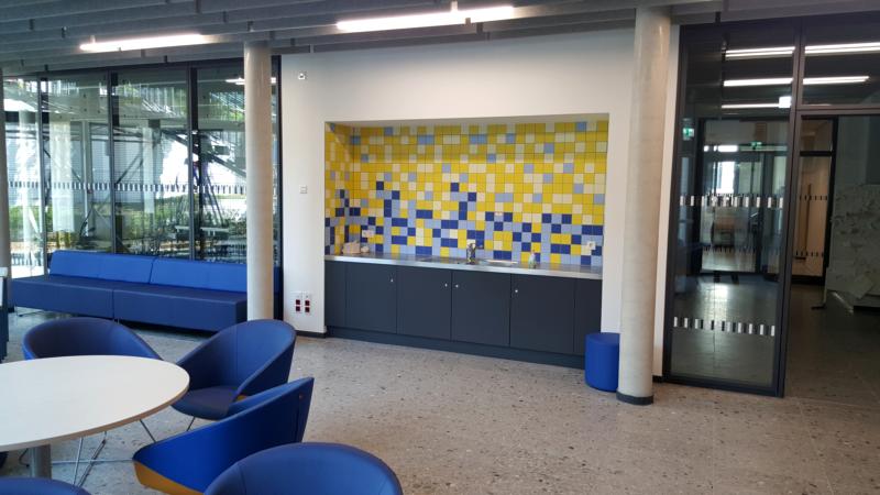 Zum Unterrichtsbeginn versammelten sich die Schülerinnen und Schüler aufgeregt vor dem Gebäude und zogen dann feierlich mit ihrer Klassenleitung ein. Großes Erstaunen riefen die liebevoll selbstgebastelten Schultüten in den KLS-Farben hervor, die jede Klasse überreicht bekam. So begann der erste Schultag im Neubau für alle auf ganz besondere Art. Begeistertes "Ah" und "Oh" schallte durch die Flure, denn das sehr helle Gebäude mit den Farbakzenten in blau und gelb gefiel allen sehr. Und zum Glück hat es auch die rote Bank, die schon Generationen von KLS-Schülerinnen und Schülern als Sitzgelegenheit gedient hat, bis in den Neubau geschafft.
