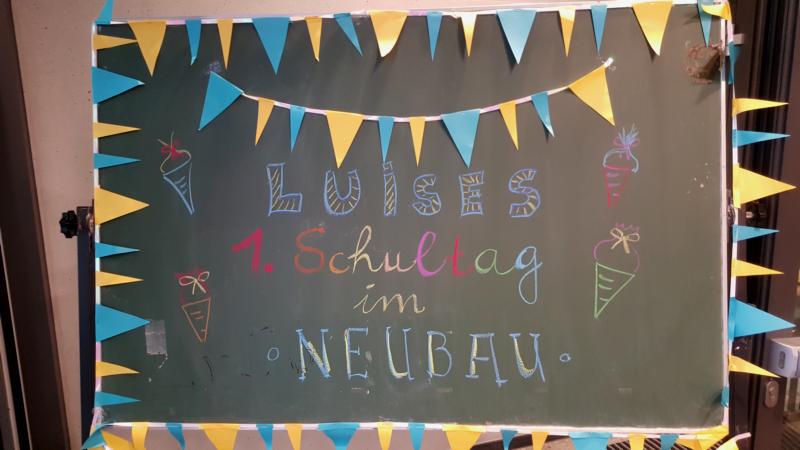 Heute war "Luises erster Schultag" im Neubau. Nach anderthalb Jahren, in denen wir vom gegenüberliegenden Schulgebäude die Bauarbeiten beobachten konnten, war es nun endlich soweit: Zum ersten Mal fand für alle der Unterricht in unserem Neubau statt.