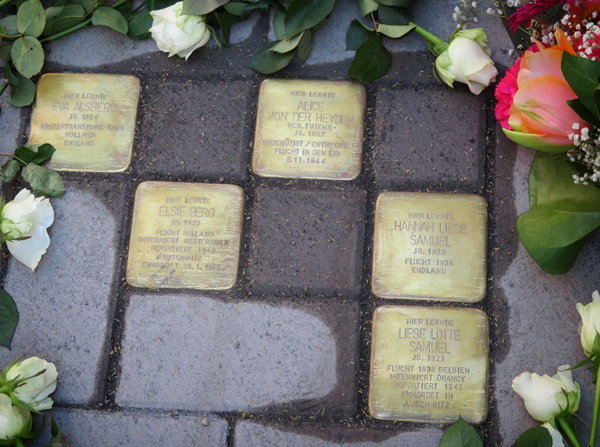 Stolpersteine vor der KLS für Elsie Berg, Eva Alsberg, Dorittta Sternschuss und Ellen Süskind