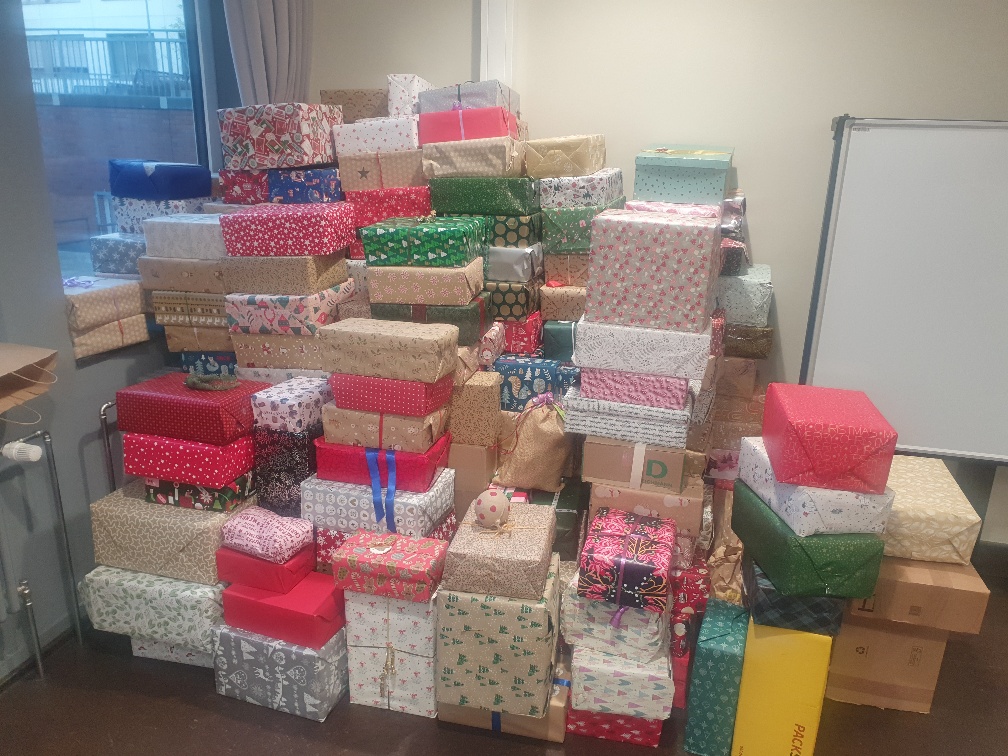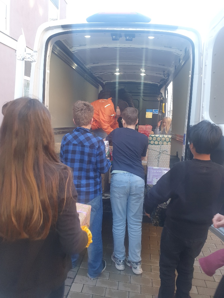 Seit Wochen haben die Mitglieder der KLS-Schulgemeinschaft Pakete mit haltbaren Lebensmitteln und Kosmetikartikeln zusammengestellt und weihnachtlich verpackt, um sich an der Aktion "Fröhliche Weihnachten für alle" der Kölner Tafel e.V. zu beteiligen. Vor allem während der Adventsfeier haben die Schülerinnen und Schüler der EF die abgegebenen Lebensmittelspenden zu zahlreichen Paketen zusammengestellt, aber auch bereits fertig gepackte Gaben wurden fleißig gesammelt. Heute wurde die Ladung von Mitarbeitern der Tafel abgeholt und die 6b half eifrig mit, alle Pakete in den Lieferwagen zu tragen. An die 300 Pakete sind so zusammengekommen, außerdem noch insgesamt 500 Euro aus Erlösen aus dem Adventsbazar und Spenden. Über all diese Zuwendungen freuen sich diejenigen, die bald die Pakete erhalten und dringend benötigen.