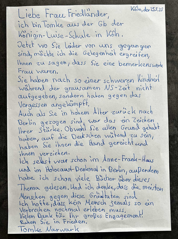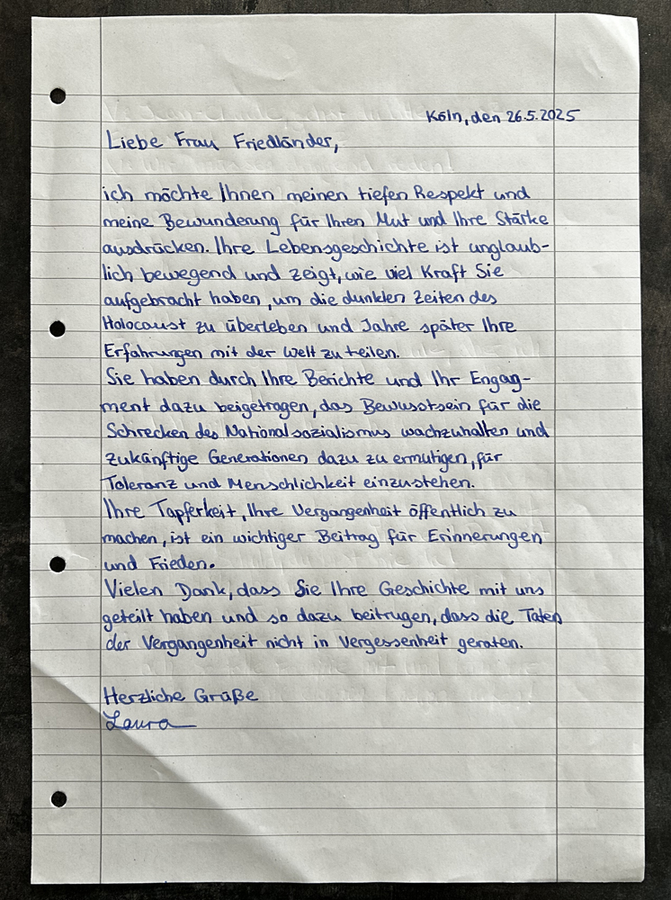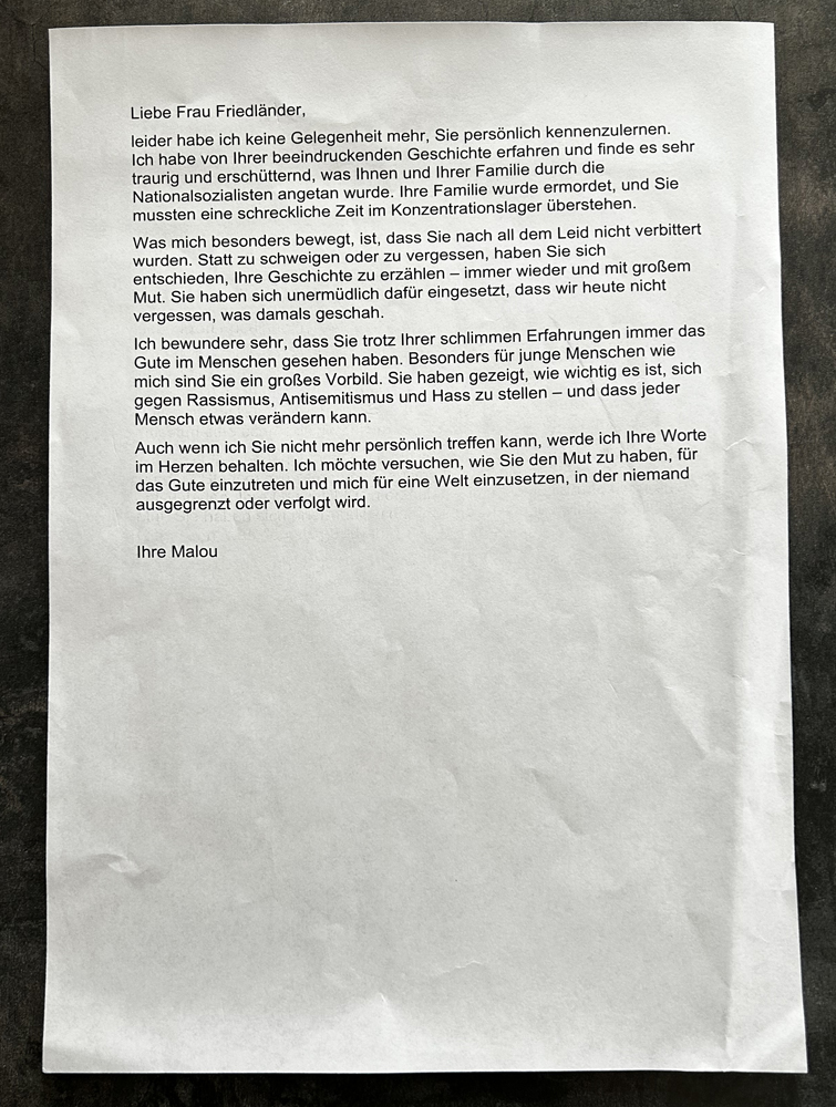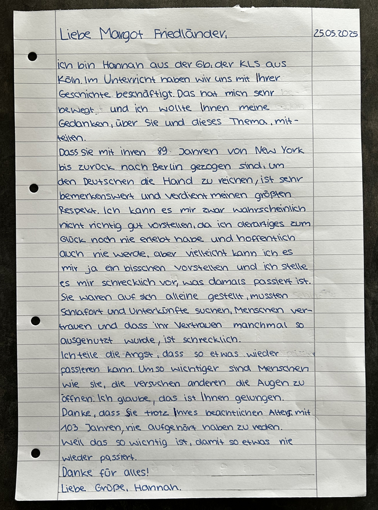Kurz nach dem Tod von Margot Friedländer hat sich die 6b mit ihrer beeindruckenden Geschichte beschäftigt. Wir haben uns den Film über sie angeguckt und anschließend unsere Gedanken als Briefe formuliert, die wir an die Margot Friedländer Stiftung schicken werden. Hier eine kleine Auswahl.