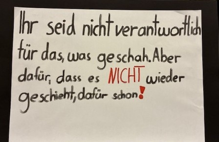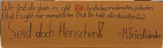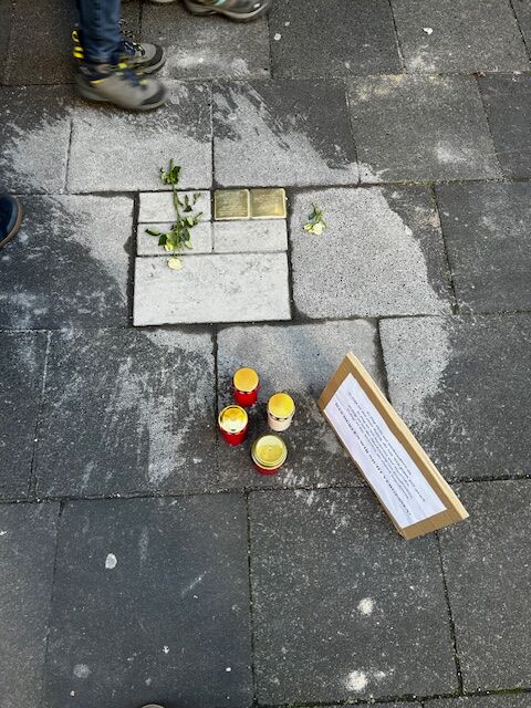 Was soweit noch alles Tradition war, haben wir die Gedenkfeier diesmal mit einem ganz neuen Schritt beendet – und zwar mit einem Rundmarsch. Dabei haben wir die neuen Stolpersteine besucht, den Opfern mit Blumen und Kerzen die Ehre erwiesen – und dabei durch unsere Präsenz und eine Vielzahl von Plakaten der Öffentlichkeit eine Botschaft zukommen lassen.