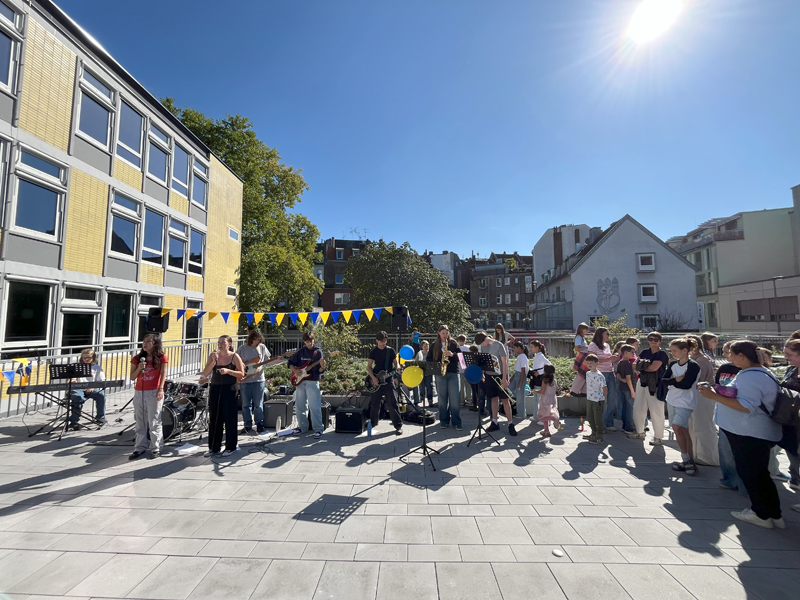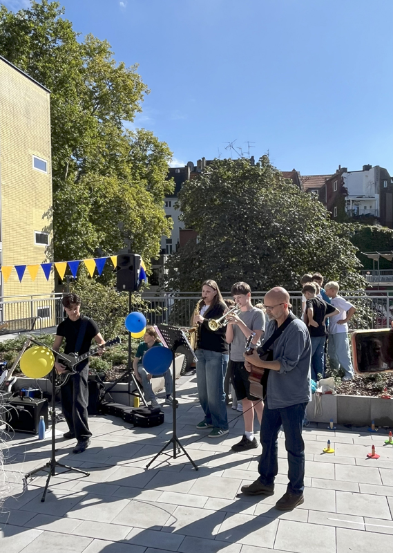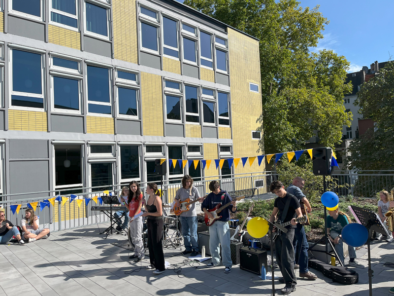 Was für ein Fest! Schon am Vormittag sah man fleißig werkelnde und dekorierende Eltern im frisch sanierten KLS-Altbau. Schönste Girlanden, Luftballons und Laternen – alle in den KLS-Farben Gelb und Blau – schmückten ganz feierlich innen und außen Luises Altbau. Endlich dann um kurz nach drei eröffnete Frau Flink gemeinsam mit der Schulband das Sommerfest 2025 mit schwungvollen Klängen – Schüler:innen, Eltern, Lehrkräfte und viele Ehemalige Abiturient:innen und Lehrkräfte strömten gut gelaunt in den instand gesetzten, schicken Altbau mit dem begrünten Turnhallendach und entdeckten überall liebevoll gestaltete Aktionen.