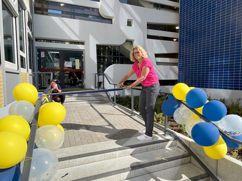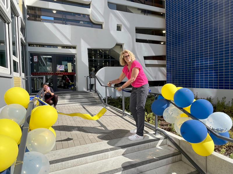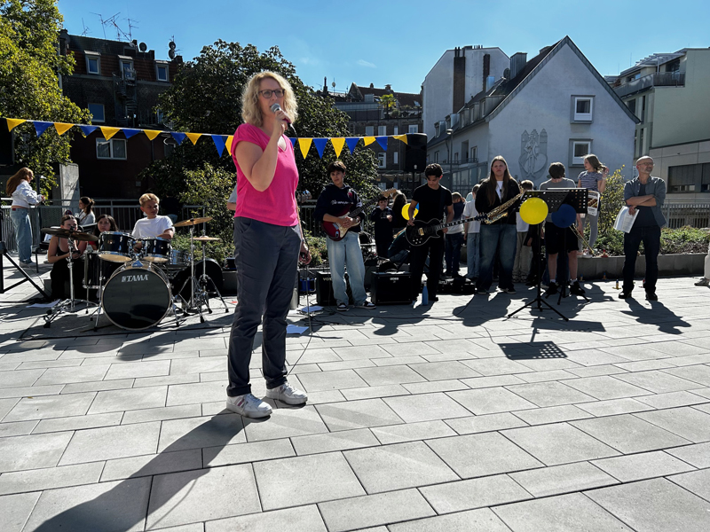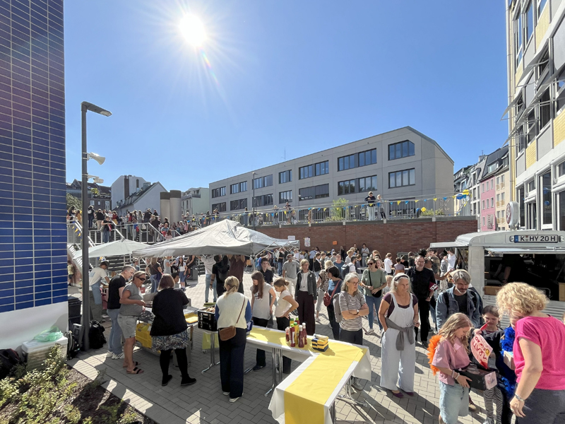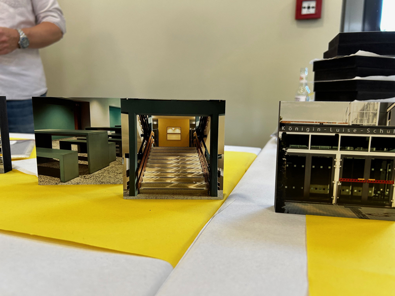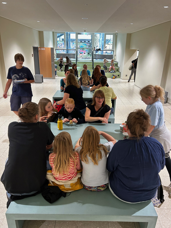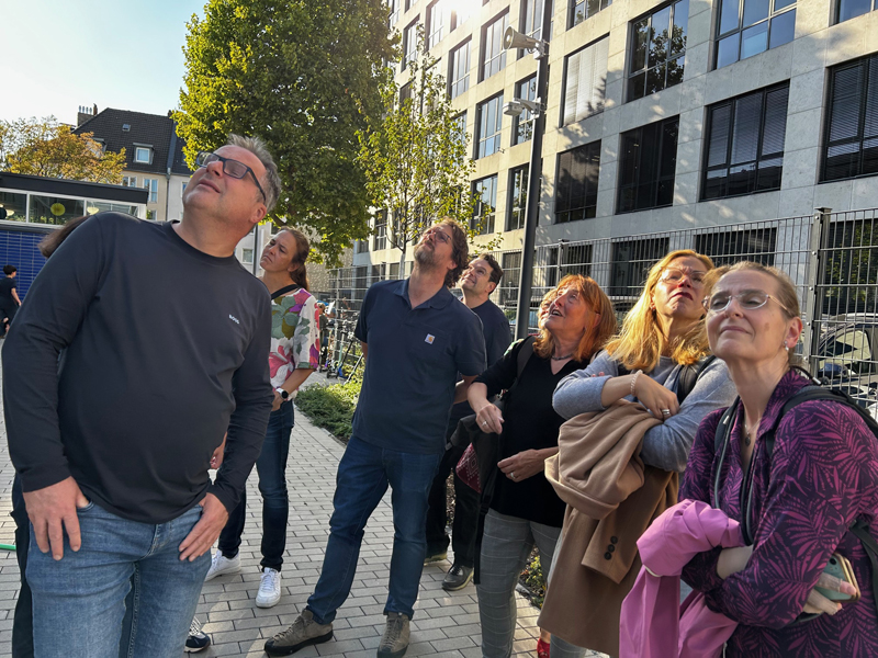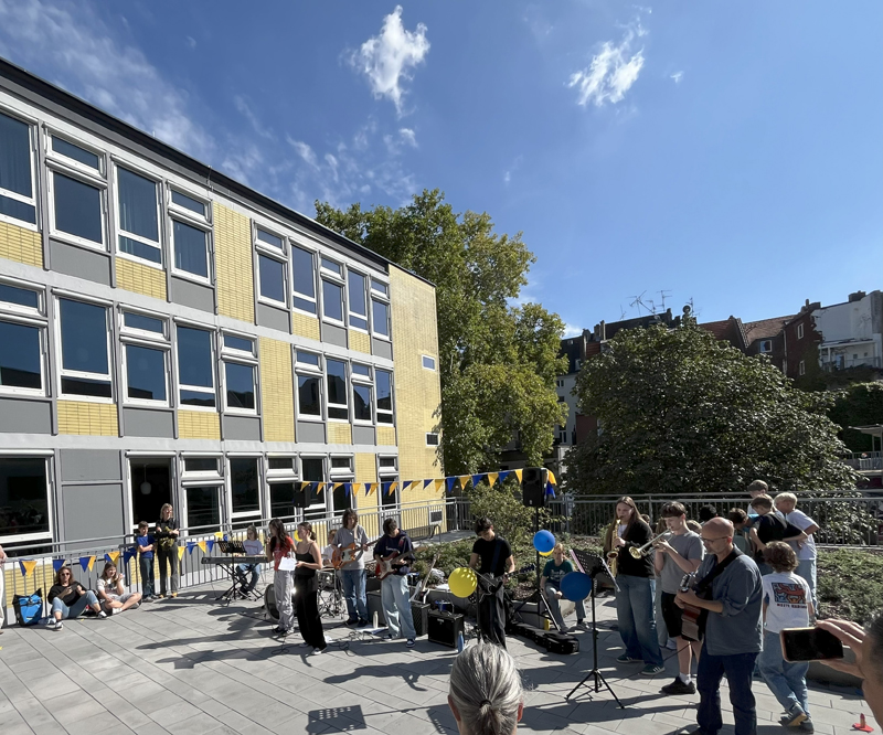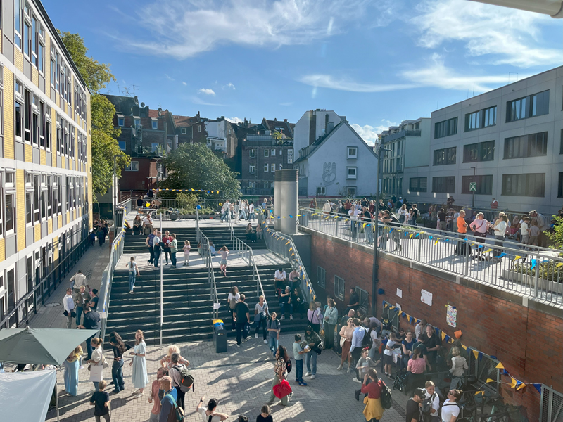 Wer Lust auf spannende Einblicke in den Altbau hatte, konnte sich Frau Pesch vom Amt für Denkmalschutz und Denkmalpflege anschließen. Zahlreiche ehemalige Abiturient:innen, Lehrkräfte, Eltern, Schüler:innen und Journalist:innen folgten ihrem aufschlussreichen Vortrag nebst Führung durch und um den restaurierten Altbau. Ein „Leuchtturm der Architektur” hätten der Architekt Peter Friedrich Schneider mit dem Künstler Gerhard Meistermann den Kölner Kindern in Form dieses besonderen Schulgebäudes erschaffen. Weitere Rundgänge ermöglichten auch unsere Lehrkräfte, die gern auf die baulichen und pädagogischen Besonderheiten der KLS hinwiesen. Interessierte Eltern und Gäste der Erprobungsstufe konnten die neuen ÜMI-Räume entdecken.