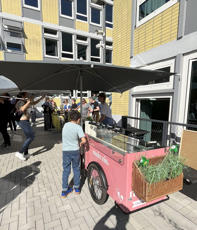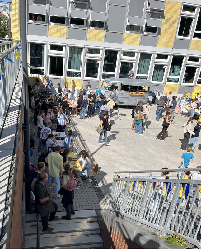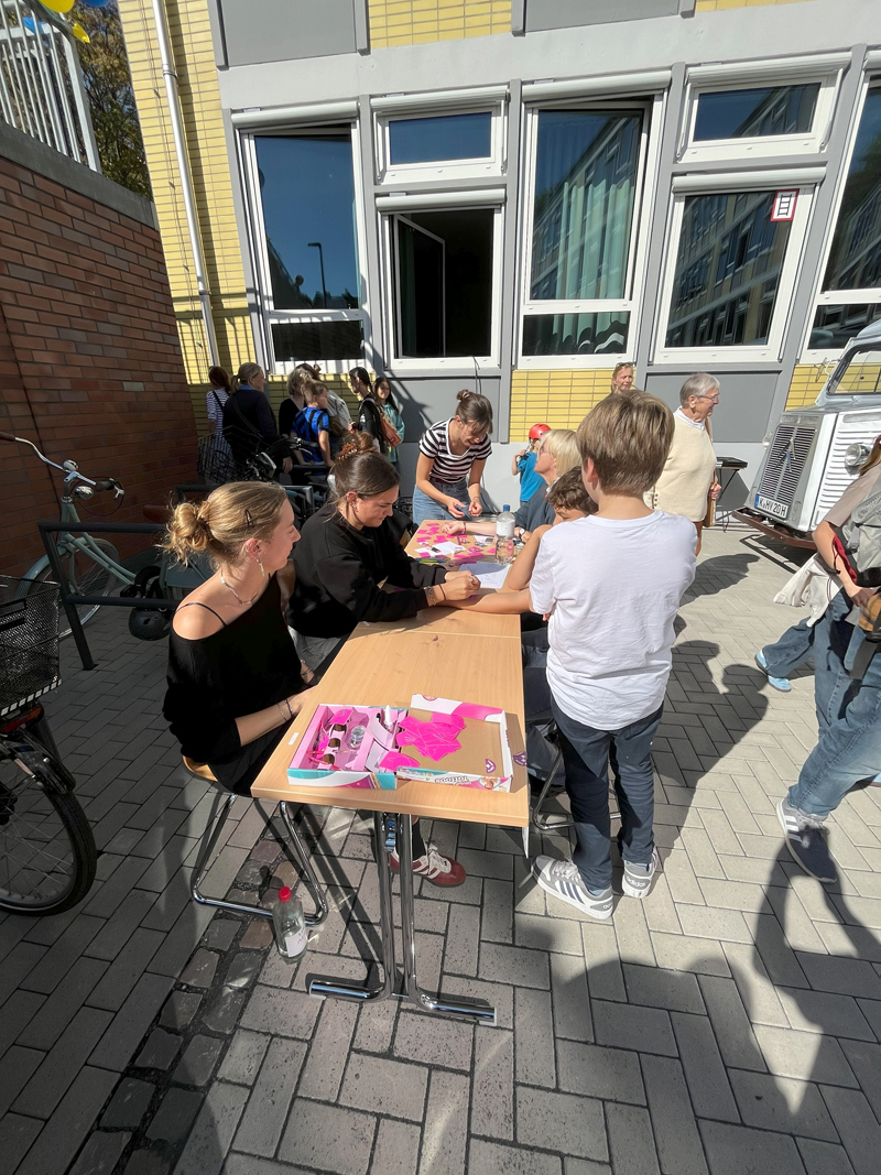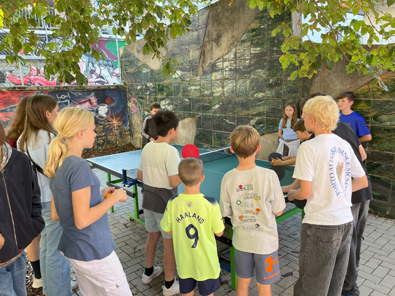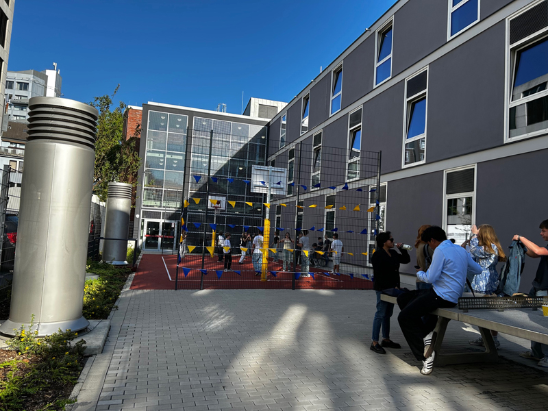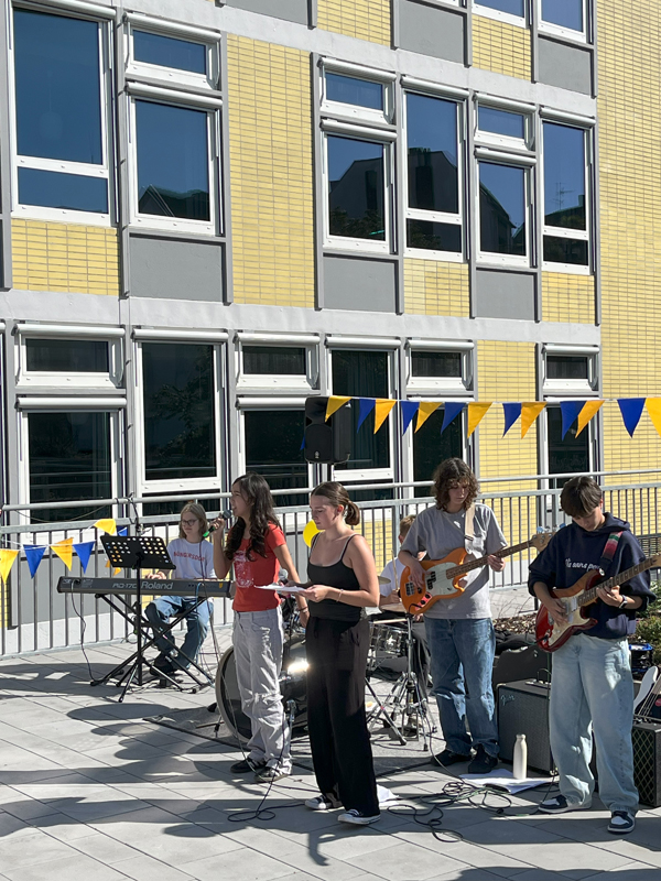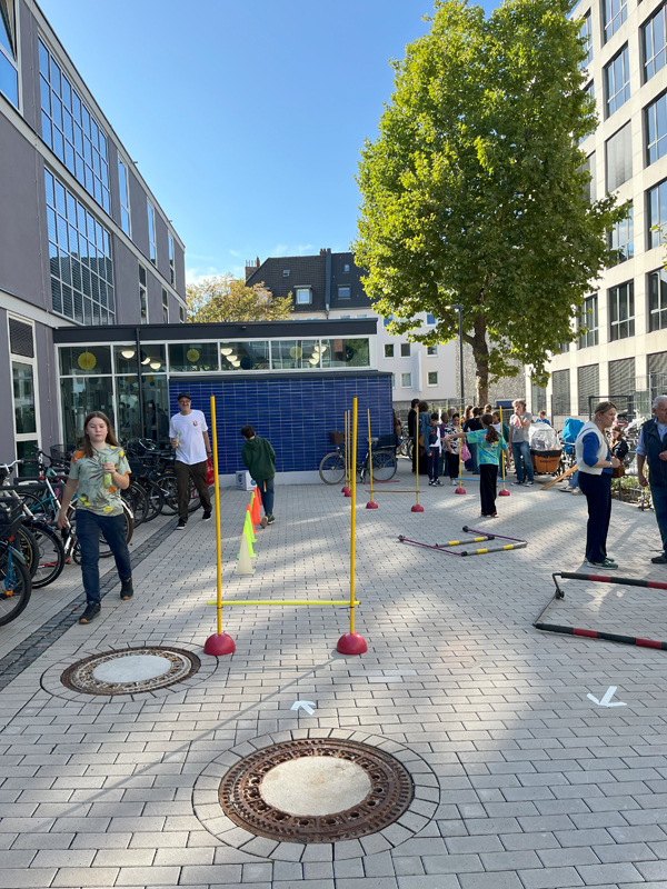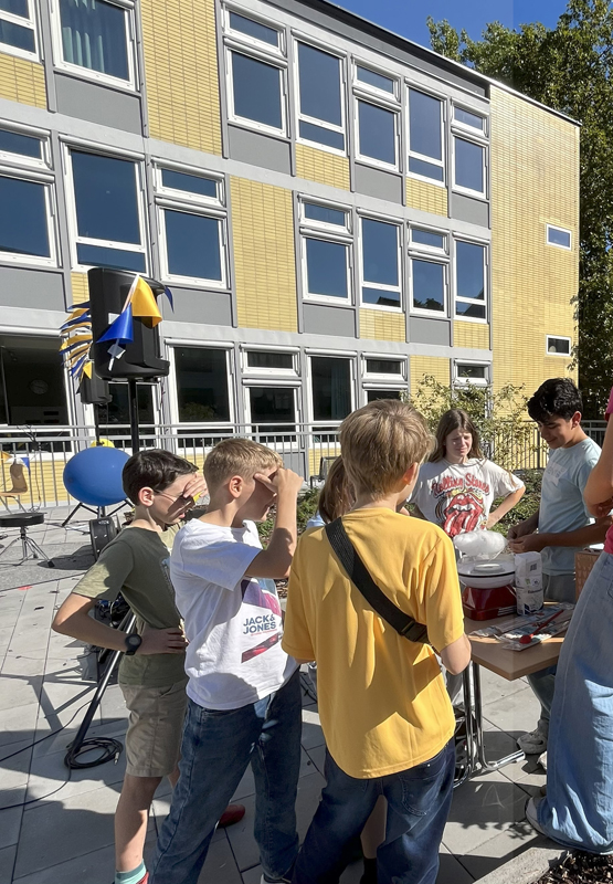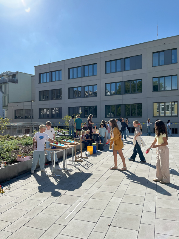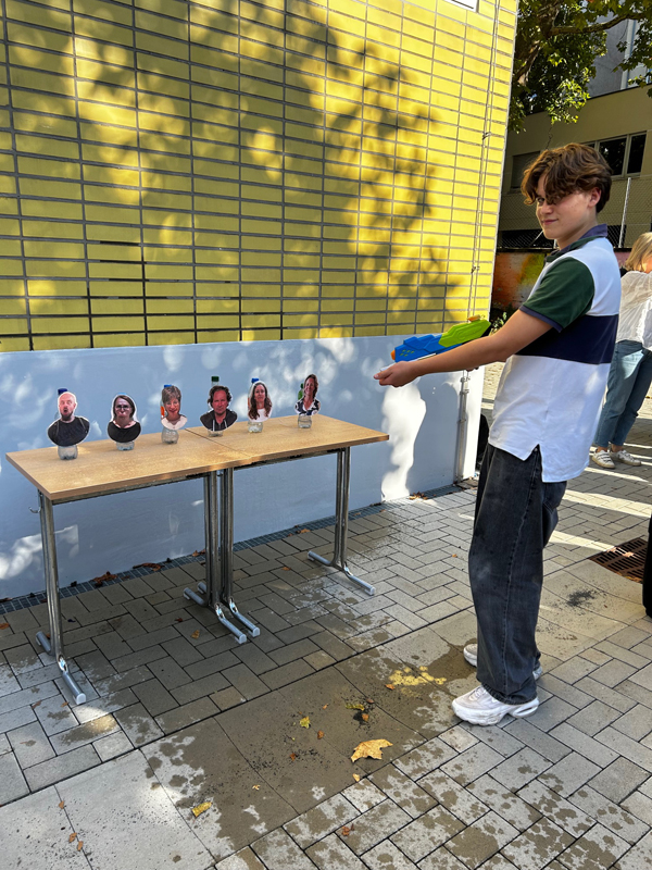 Eine Fotodokumentation zeigte eindrucksvoll die Sanierung des Altbaus, ein Tischtennisrundlaufturnier sowie die Wasserpistolen-Challenge lockten viele Schüler:innen an. Sportlich ging es auch auf dem neuen Basketballplatz zu mit einem Hobbyhorsing-Parcours und natürlich Basketball.