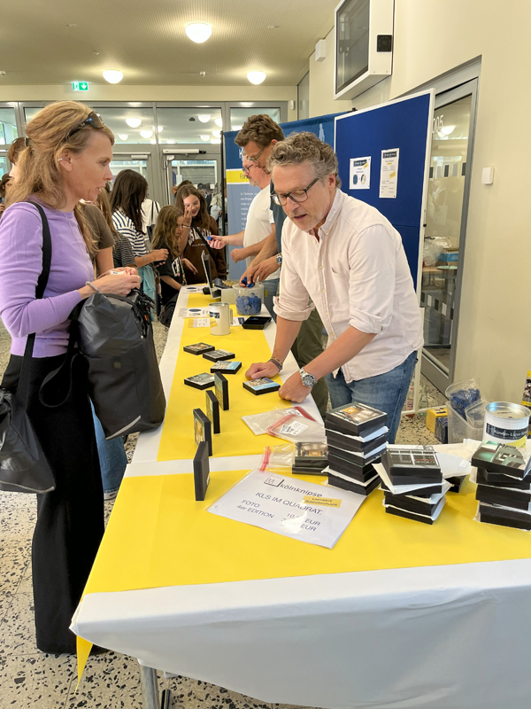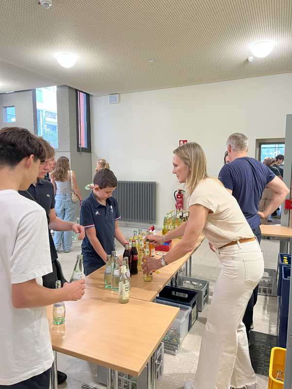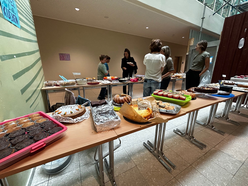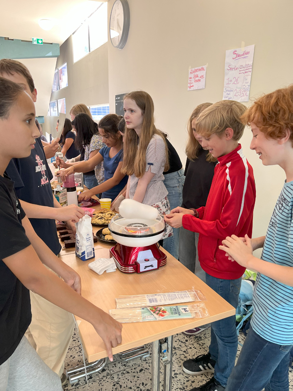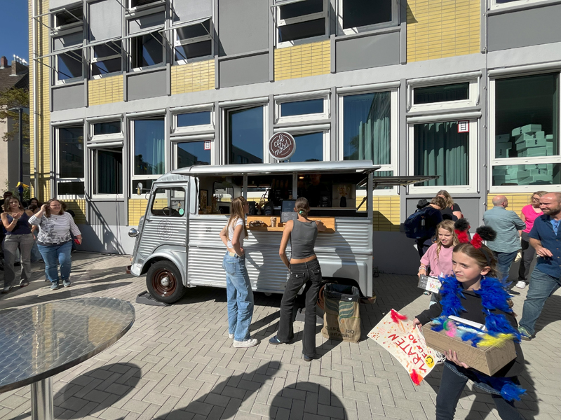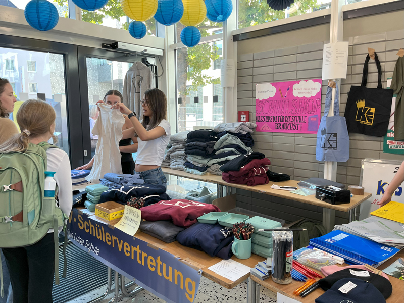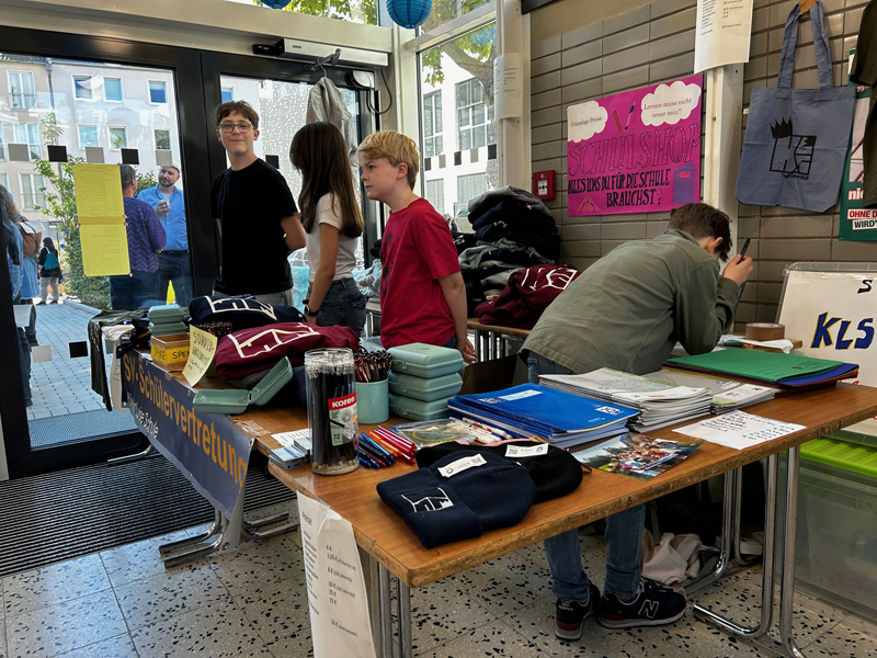 Im Windfang des Eingangs lockten Tombola und Curiosa der Q1 sowie cooler SV-Merchandise. Aktuelle Fotos des Altbaus mit tollen Detailaufnahmen und natürlich dem obligatorischen Bon-Verkauf gab es beim Stand des Fördervereins. Die Bons fanden beste Verwendung beim Kaffee-Truck mit warmen und erfrischenden Getränken und natürlich am Würstchen-Stand, der bei keinem Fest fehlen darf, der KLS-Eltern. Auch die10b und mit den Eltern der Stufe 10 versorgten die Gäste mit Getränken, während die 7a mit Smoothies und Snacks begeisterte. Im Lichthof warteten Salate, Fingerfood und Kuchen – nur kulinarische Highlights bei schönstem Wetter!