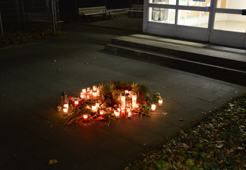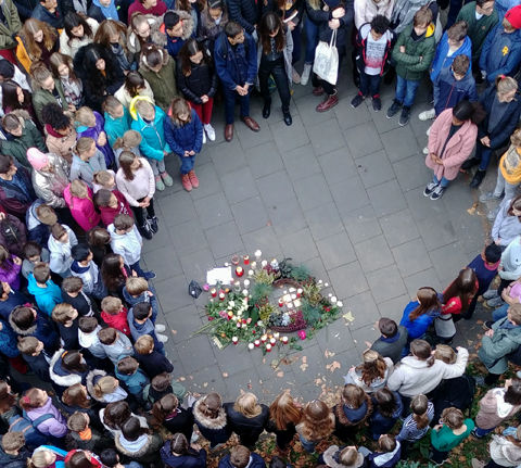 Schülerinnen und Schüler trugen Zitate von Augenzeugen jener Reichspogromnacht vor, anschließend wurden Blumen und Kerzen niedergelegt und aller Opfer von Ausgrenzung in einer Schweigeminute gedacht. Die Anteilnahme war sehr groß, selbst Ehemalige und Eltern waren gekommen, um an diesem Gedenken teilzunehmen.