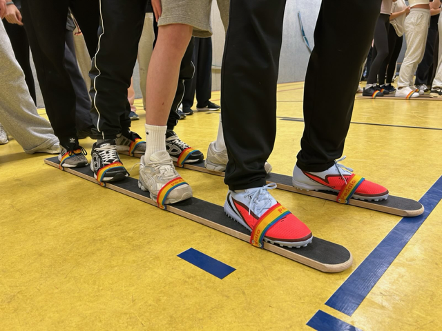 Natürlich lief nicht jede Disziplin vollkommen reibungslos, wie zum Beispiel bei den Holzskiern. Hier ging es vor allem um Tempo und eine gute Abstimmung im Team, doch beim Start flog auch schon einmal der ein oder andere Schuh durch die Halle, was jedoch stets für viele Lacher sorgte.