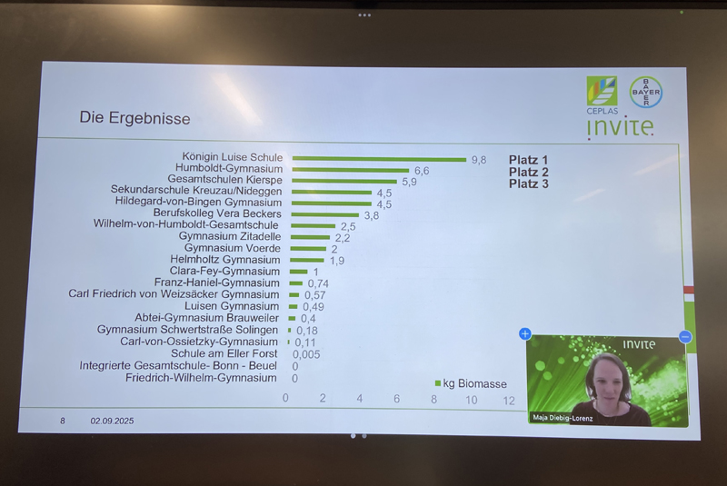 Die Challenge wurde von den Pharmafirmen BAYER, CEPLAS, Invite und dem Lifehub Netzwerk als Schulwettbewerb ins Leben gerufen und finanziert. Ziel hierbei ist auf 1m2-Oberfläche so viel CO2 in Biomasse zu fixieren, wie möglich ist. Unsere Garten AG hat innerhalb der vorgegebenen Zeit insgesamt knapp 10 kg Biomasse geerntet. Diese Masse entspricht ungefähr 18-20 kg fixiertem CO2.