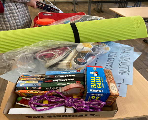 In den Projekttagen hatten wir um gebrauchte, aber gut erhaltene Spenden gebeten, zum Beispiel Kleidung, Bücher, Spielzeug und CDs, die wir ebenfalls zum Verkauf angeboten haben. Dabei haben wir 180 € eingenommen, die wir anschließend zusammen mit den übriggebliebenen Spenden dem Oxfam-Shop am Friesenplatz gespendet haben. Oxfam ist eine Organisation, die sich gegen Armut in der Welt einsetzt.