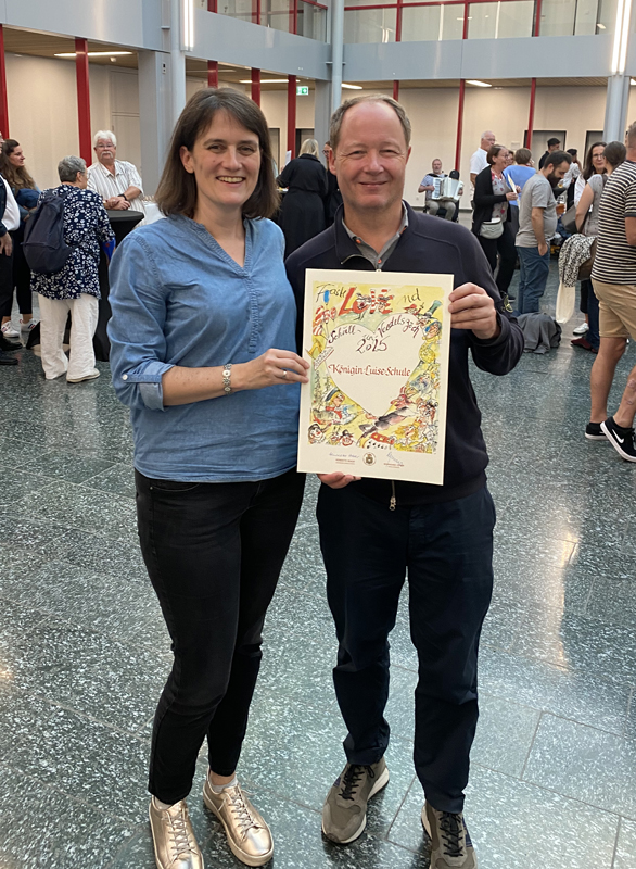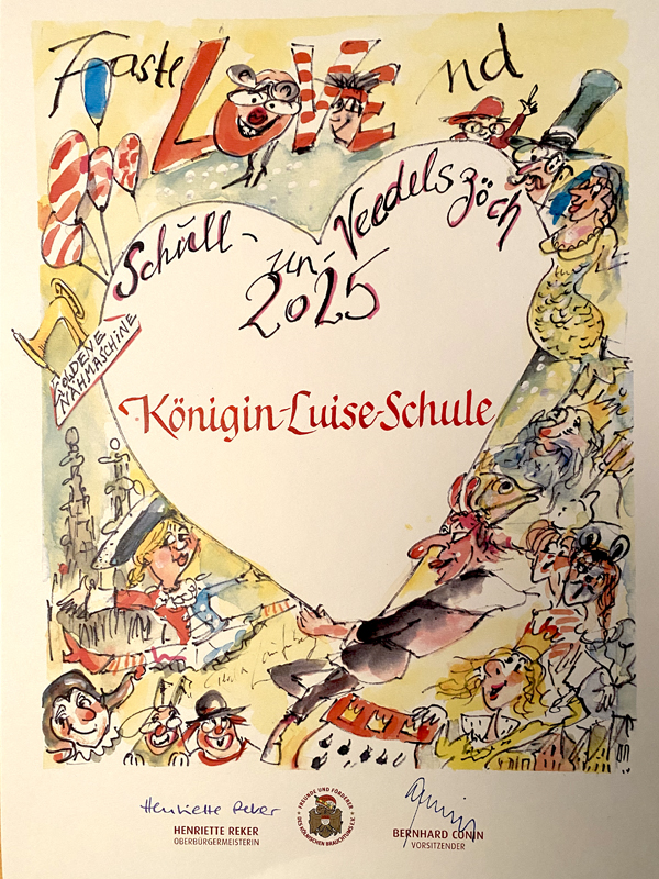Luises jecke Vertreter:innen der Karnevals-AG Yvette Barth und Anselm Riddermann nahmen Anfang September die Urkunde zur Teilnahme an den Schull- un Veedelszöch 2025 entgegennehmen – ein besonderer Moment für unsere Königin-Luise-Schule!