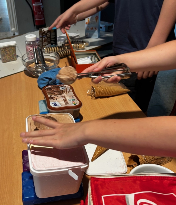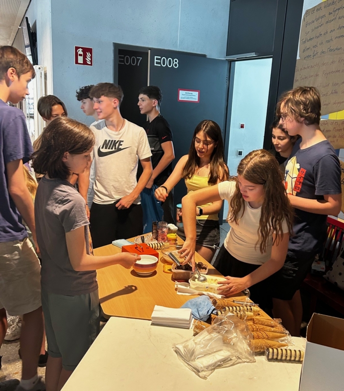 Am Dienstag, den 1. Juli 2025, gab es dann in der ersten und zweiten großen Pause in sengender Hitze, zwischen den Kurzstunden Eis für alle. Ob Schoko, Vanille, Erdbeere oder Stracciatella – in der ersten Runde war alles ausverkauft, sodass weitere Eiscreme organisiert werden musste. Also konnte der Verkauf in der zweiten großen Pause zur Freude aller fortgesetzt werden. Vor der roten Bank im Neubau und dem neugestalteten Turnhallendach, bildeten sich lange Schlangen, die auf Eiscreme (auf Wunsch mit Streusel!) geduldig warteten.