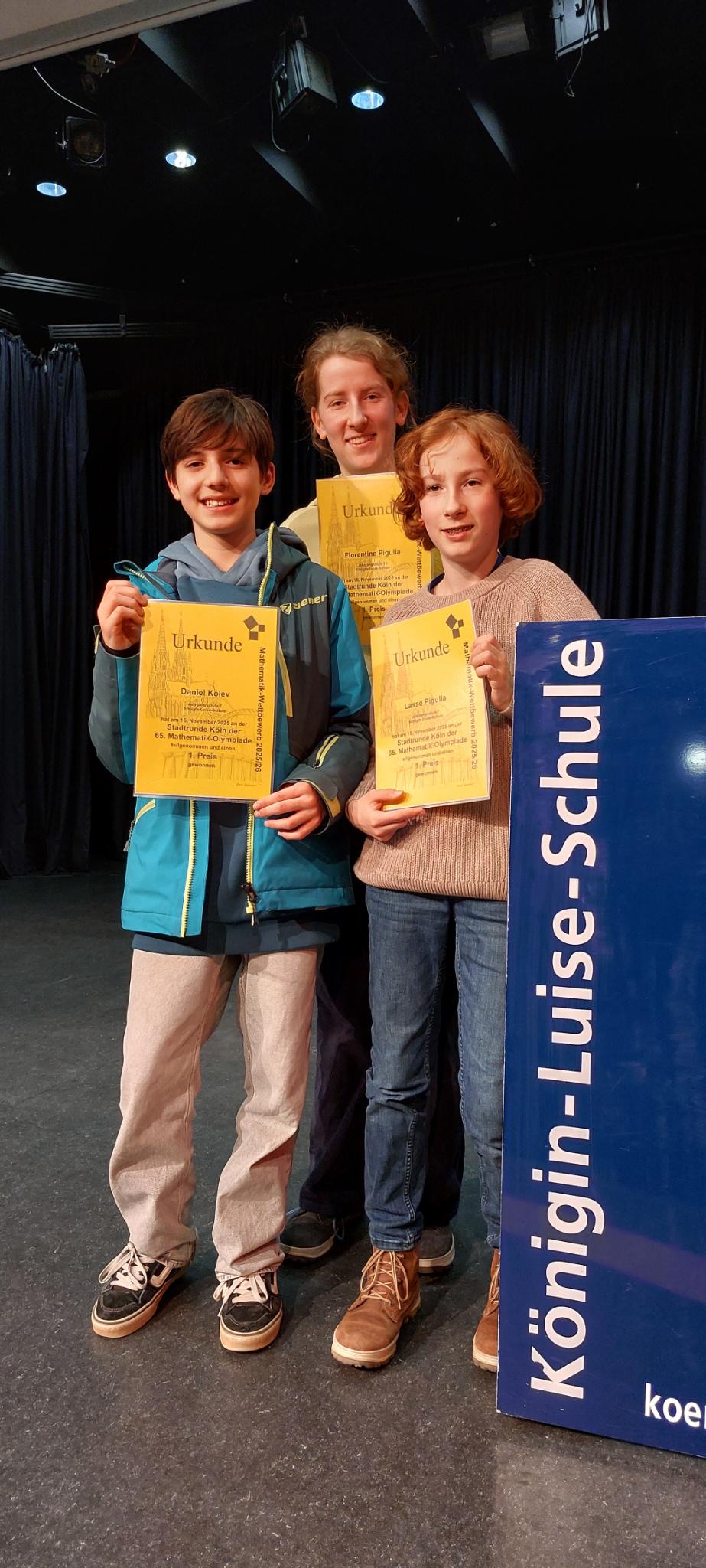 Große Preisverleihung im Pädagogischen Zentrum der Königin-Luise-Schule am Montag, den 1. Dezember 2025, und unsere Schüler:innen nahmen feierlich ihre Preise des beliebten Mathe-Wettbewerbs entgegen. Darunter waren auch Florentine (10. Jahrgangsstufe) und Lasse und Daniel (7. Klasse), die 1. Preise für die diesjährige Kölner Stadtrunde der Mathe-Olympiade erhielten.