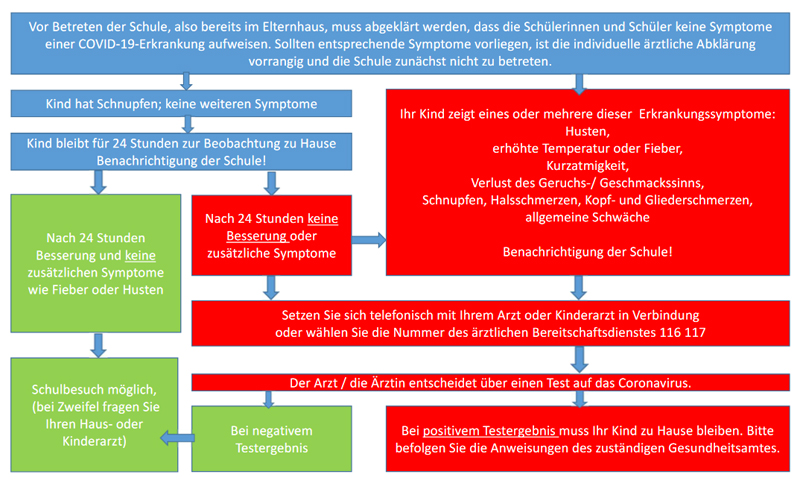 Vielfach rufen besorgte Eltern im Sekretariat an, um zu fragen, wie sie sich verhalten sollen, wenn ihr Kind Erkältungssymptome aufweist. Das Ministerium hat in einem Schaubild übersichtlich dargestellt, wie vorzugehen ist.