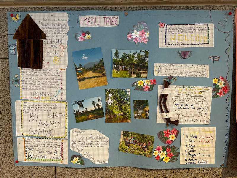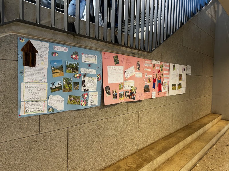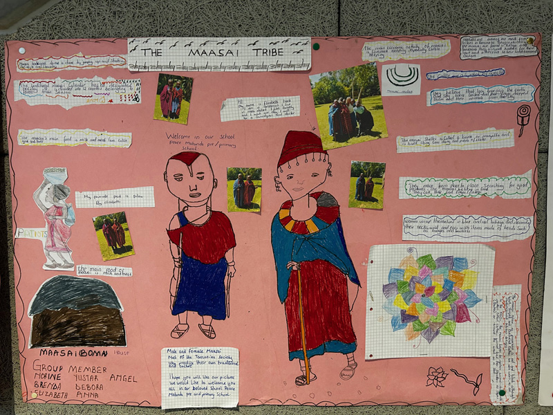Die Klasse 5b hat sich also zunächst ein kurzes Video angeschaut, das dieses Hilfsprojekt vorstellt. Ganz berührt waren die Kinder von den Bildern und dieser so ganz anderen Welt, die darin gezeigt wird. So entstand nicht nur sofort die Bereitschaft, bei „Aktion Tagwerk“ mitzumachen, um eifrig Spendengelder für dieses wichtige Projekt zu sammeln, sondern die Kinder hatten auch den Wunsch, einen lieben persönlichen Gruß an die Kinder in Peace Matunda zu senden. Aus diesem lieben Gruß wurde dank Claudia Friedrich, der Gründerin von Small Changes aus Köln, schlussendlich mehr: Zunächst haben unsere Kinder der Klasse 5b in Form von selbst gestalteten Plakaten und kleinen Steckbriefen, die liebevoll verziert und mit kleinen Geschenken beklebt wurden, über ihr Leben, ihre Ziele und ihre Träume hier in Deutschland berichtet. Es wurde über unsere kleine Schule geschrieben, über Hobbys, Sportvereine und natürlich auch über den Kölner Karneval. Da Frau Friedrich Ende Februar nach Tansania geflogen ist, war es leicht, ihr unsere gesammelten Werke vor ihrer Reise zukommen zu lassen. In Peace Matunda haben sich wiederum die Kinder der 5. und 6. Klasse sehr über unsere Werke gefreut und im Gegenzug etwas für uns gestaltet, das Frau Friedrich natürlich für uns mit nach Köln zurückgebracht hat. Diese tollen Grüße sind nun im Foyer unseres Neubaus zu sehen. Was für ein schönes Projekt, das einmal mehr zeigt, wie leicht es ist, Grenzen und Differenzen zu überwinden und damit Gutes zu tun! Darauf ist die 5b mit ihren Klassenlehrerinnen Frau Schäfers und Frau Steinbuß stolz.