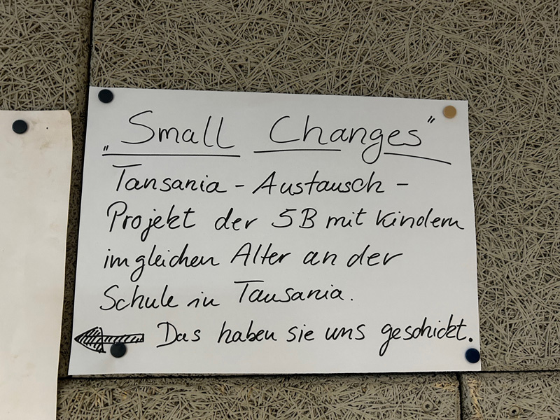 „Wo geht eigentlich unser Spendengeld hin?“ Das haben sich in der Vorbereitung unseres diesjährigen Tags für „Aktion Tagwerk“ auch die Schüler:innen der 5b gefragt. Die Hälfte unserer Einnahmen bei Aktion Tagwerk und beim Sponsorenlauf spendet die KLS an die Organisation „Small Changes“, die Kindern in Tansania eine bessere Chance auf ein gutes Leben ermöglicht, indem sie das dortige Projekt „Peace Matunda“ unterstützt.