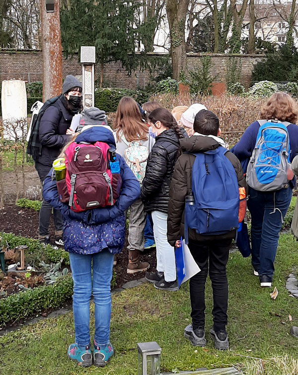 Ein Projekt der NABU ist das Friedhofsprojekt: „Wilde & lebendige Friedhöfe - Hotspots der Artenvielfalt mitten in der Großstadt“. Frau Romero zeigte uns die von NABU-Aktivisten aufgehängte Nistkästen und die Bestattungsgärten mit ihrer insektenfreundlichen Bepflanzung. Letztes Jahr wurden auf dem Friedhof Melaten Vogeltränken aufgestellt, da einige Brunnen abgestellt werden mussten. Der NABU hat auf dem Melaten auch eine Partnerschaft für ein altes, denkmalgeschützt Grab übernommen und dieses insektenfreundlich bepflanzt.
