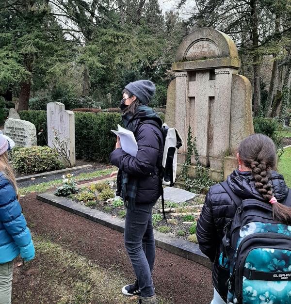 Am Mittwoch besuchten wir den Melaten-Friedhof im Herzen Kölns und wurden dabei von zwei Expertinnen des Nabu begleitet. Wir waren verblüfft, wie viele und welche Vögel man in dieser Oase inmitten der Stadt antreffen kann. Kaum waren wir da, haben wir schon einen Mäusebussard dabei beobachten können, wie er eine Maus erbeutet, keine zehn Meter vom Eingang entfernt. Wir konnten einige von den über 100 Vögel- und Fledermausbrutkästen entdecken, die der NABU auf jedem der vier großen Friedhöfe jeweils angebracht hat. Auch sorgt er dafür, dass ausreichend Meisenknödel vorhanden sind und sogenannte Insektenhotels, wie man sie auch von unserem Schulhof kennt, aufgestellt werden.