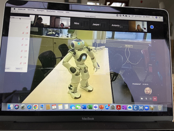 Am zweiten und dritten Tag erfolgten die Online-Kurse. Der Workshop „Lernende Roboter – Programmieren mit NAO“ wurde von teutolab (Universität Bielefeld, u.a. bekannt für Biotechnologie) durchgeführt. Zunächst haben wir die Definition von Lernen herausgearbeitet (Lernen = Erwerb, Veränderung, Abbau von Erlebens- und Verhaltensweisen durch bestimmte Umwelterfahrungen und Reiz-Reaktions-Beziehungen mittels Sinnesorgane) und durch Erprobung des NimGame das (eigenständige) Lernen von Computern kennengelernt. In einem Duell mit dem Computer wird abwechselnd eine Anzahl von Gegenständen dem Spiel entnommen; verloren hat der, der den letzten Gegenstand nehmen muss. Wir konnten uns hier aussuchen, ob der Computer zufällig, lernend oder mit Strategie spielen sollte. Die Züge des Computers sollten wir mit positiv, neutral oder negativ bewerten. Spielt der Computer zufällig und der Mensch strategisch, gewinnt der Mensch fast durchgehend. Sobald der Computer jedoch durch unser Feedback lernt, entwickelt dieser eine Strategie und kann den Menschen übertreffen.