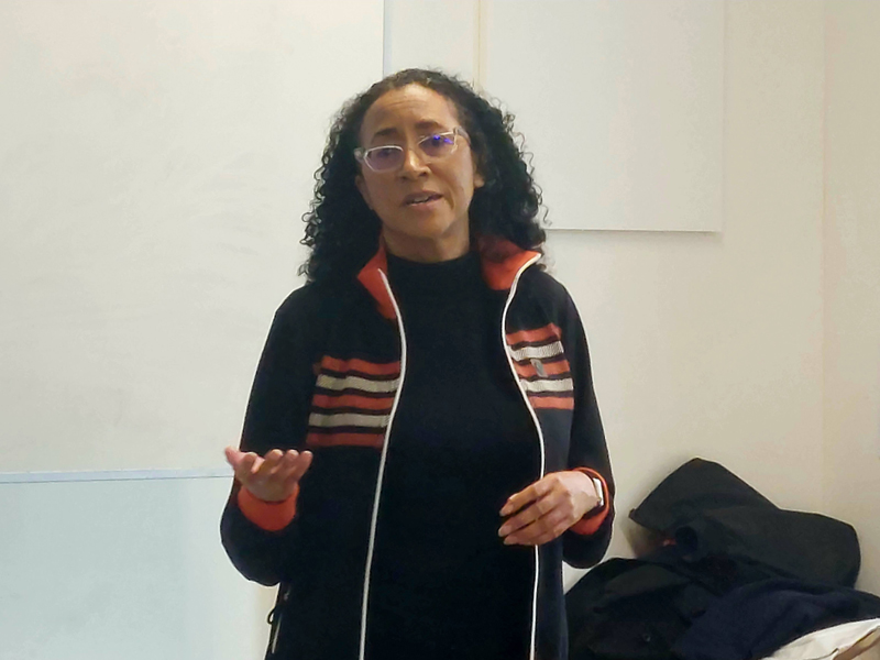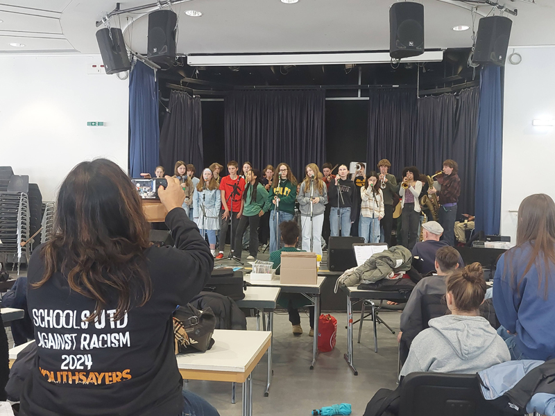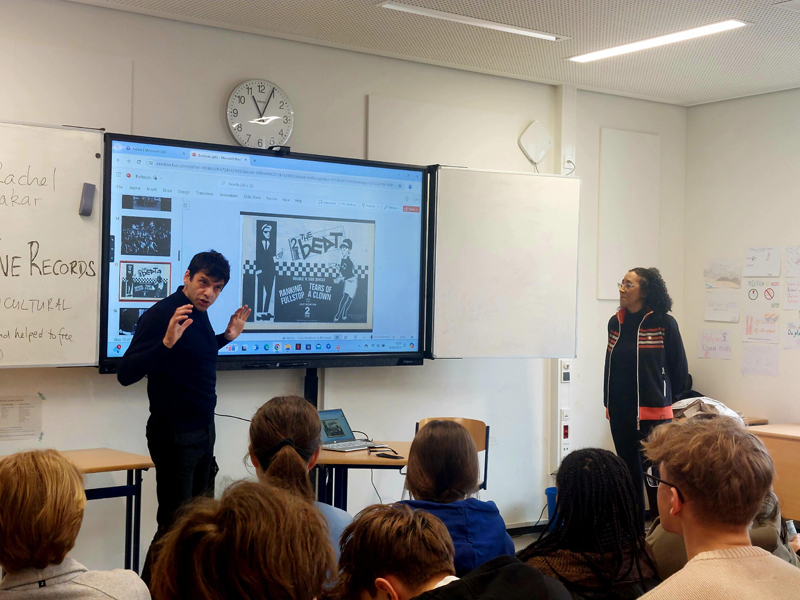 Unterstützt wurde er von der bekannten Sängerin Rhoda Dakar, welche aus erster Hand über diese Zeit berichtete, uns allen einen beeindruckenden Einblick in ihr Leben gab und auch zeigte, wie man mit Musik Rassismus bekämpfen kann und Menschen zusammenbringt. In der zweiten Pause gaben dann die Youthsayers, die schon seit zwei Tagen probten, mit Schüler:innen der KLS und der Charter School ein Pausenkonzert – oder wie sie es nannten ein “open rehearsal” —, wobei sie einige Songs performten, die sie auch auf dem Freedom Sounds Festival am Samstag spielen. So haben sie ihr Publikum begeistert, leicht die Pause überbrückt und sogar noch etwas in den Unterricht hinein gespielt!