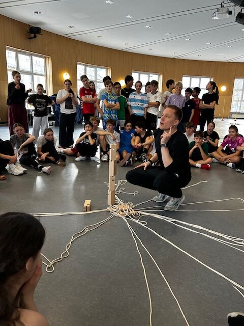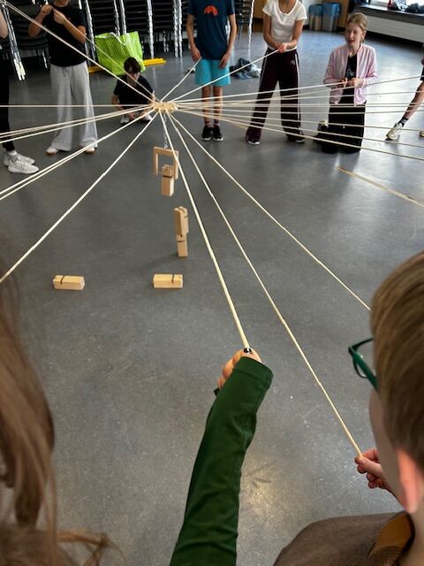 Das letzte Spiel bestand aus einem Haken, an dem 24 Bänder befestigt waren. Jeder aus dem eigenen Team musste eins dieser Seile am Seilende festhalten. Gemeinsam hieß es fünf Holzklötze, die an verschiedenen Stellen Öffnungen hatten, mit dem Haken aufeinander zu stellen, so dass ein Turm entsteht. Da waren mehr als drei Versuche nötig!