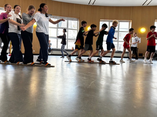 Der Sports Day wird in zwei Teile geteilt. Im ersten Teil waren die 7. Klassen in den Sporthallen und haben Volleyball gespielt. Jedes Volleyball-Team hatte vier Spiele gegen die anderen Klassen in seiner Stufe. Der zweite Teil bestand aus Gemeinschaftsspielen in der Klasse. Damit fingen die 8 Klassen an. Das erste Spiel war ein Staffellauf, bei dem man mit einem Partner die Beine zusammengebunden bekommen hat. Das bedeutet, dass man zu zweit nur noch drei anstatt vier Füße hatte. Das zweite Spiel war Tauziehen. Das vorletzte Spiel war wieder ein Staffellauf, bei dem man sich in Teams aus vier Personen zusammentun musste. Auf zwei Holzbrettern wie Skier, in die wir die Füße feststeckten, liefen jeweils vier Schülerinnen und Schüler zusammen. Da waren Teamgeist, Koordination und Schnelligkeit gefragt.