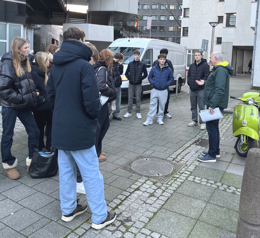 Wir, die Religionskurse der 10. Klasse, haben am 28. November die Erinnerungsstelle und das Museum des ehemaligen jüdischen Gymnasiums, der Jawne, besucht. Herr Dr. Lemaire führte uns über das ehemalige Schulgrundstück der Jawne und uns wurde erklärt, wie das Leben der jüdischen Kölner immer mehr eingeschränkt wurde. Wir fanden es sehr faszinierend, dass in der St.- Apern-Straße heute noch immer dieselben Häuser zu sehen sind, die Straße ähnelt – wie ein Foto aus den 1930er Jahren zeigt- also der alten Straße sehr.