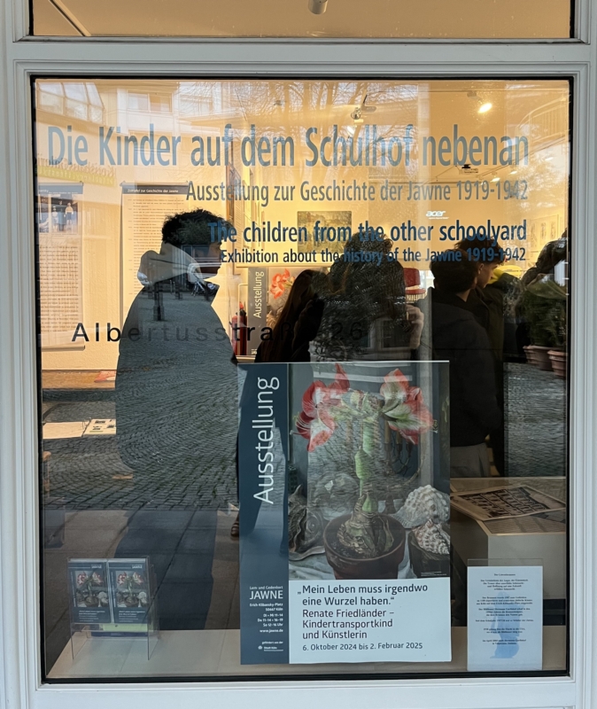 Wir erfuhren, dass der damalige Direktor der Jawne, Erich Klibansky, ungefähr 130 Kinder und Jugendlichen das Leben gerettet hat, indem er diese Anfang 1939 nach England schickte. Wir durften Texte, Biographien und Briefe, von verschiedenen Personen lesen, die es mit Hilfe des Direktors geschafft haben, nach England zu flüchten. Eine von ihnen ist Henny Franks, die immer noch ab und zu zum Erinnerungsort kommt.