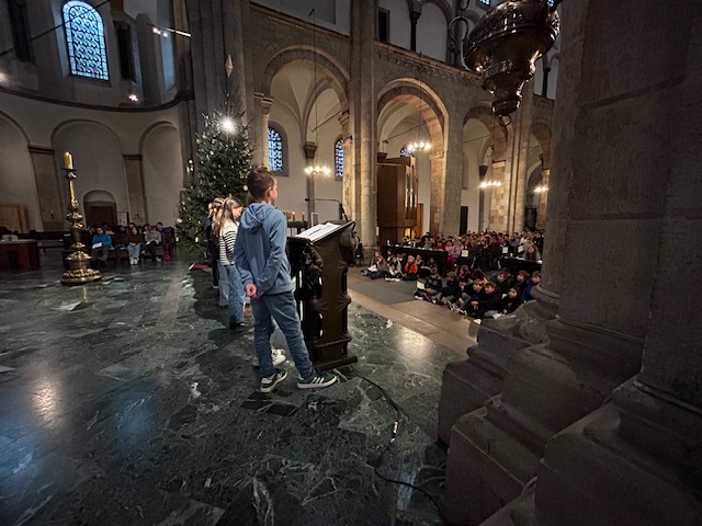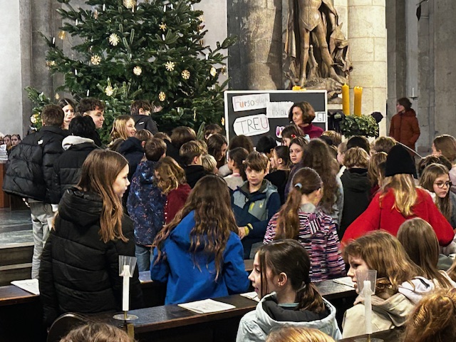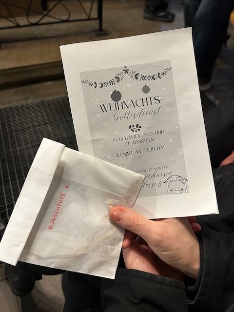 „Kommt an - Seid da!“ Unter diesem Motto haben die Schüler*innen der Religionskurse der 6. Klassen am letzten Schultag vor den Weihnachtsferien zum diesjährigen Adventsgottesdienst nach St. Aposteln eingeladen. „Ankommen“ war dann auch das Thema. Zur Ankunft in der Kirche bekamen alle eine kleine „Wunschtüte“ überreicht, was es hiermit auf sich hatte, wurde später allen ersichtlich.