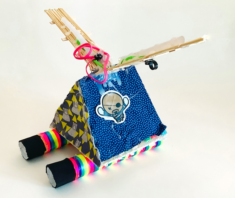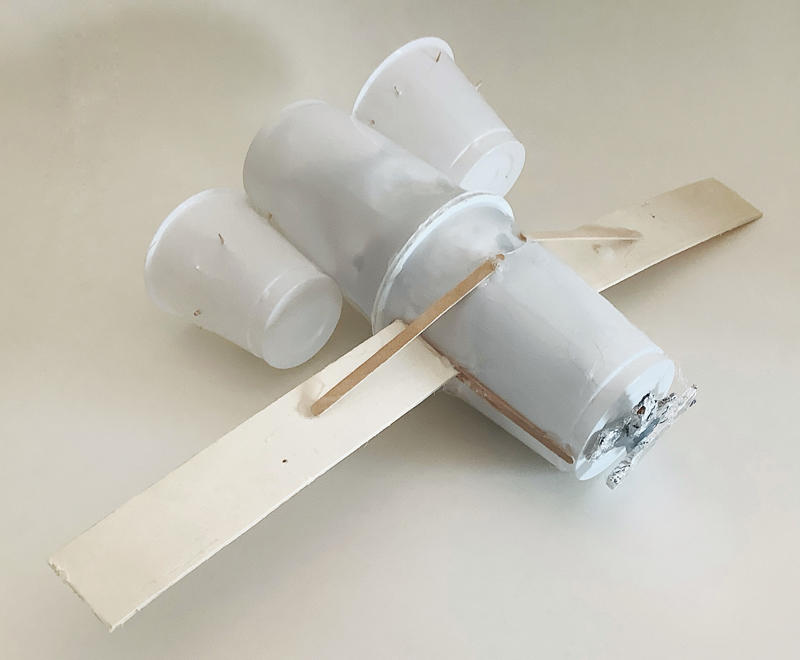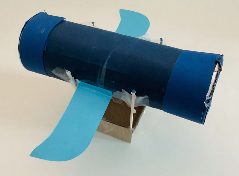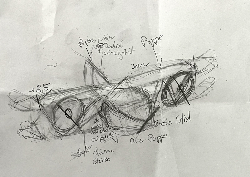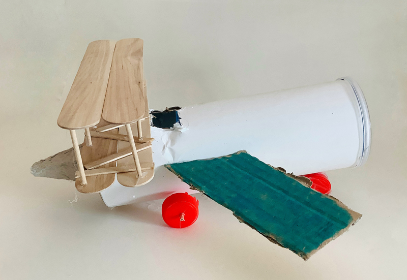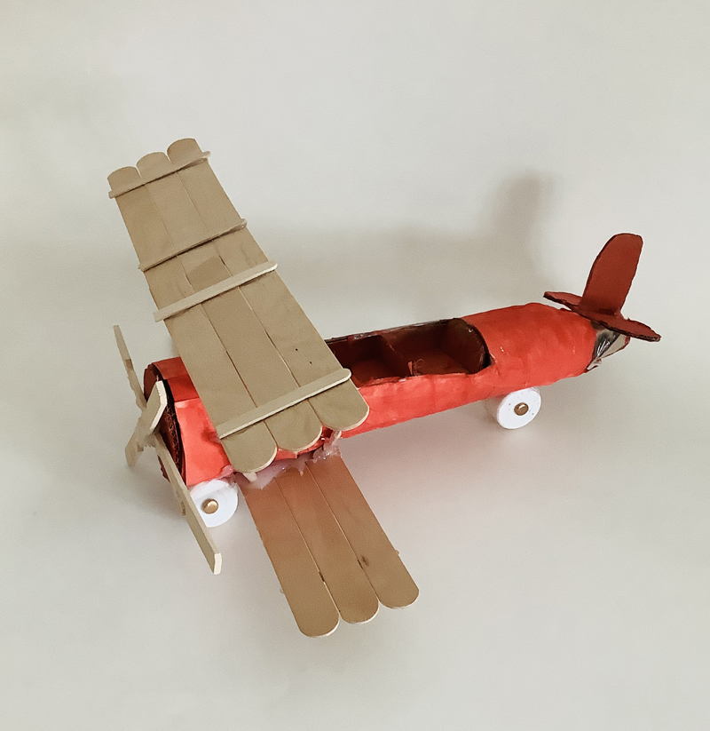 Wir haben vorher Zeichnungen angefertigt und uns überlegt, aus welchen Materialien die Flugobjekte bestehen sollen. Zuhause suchten wir nützliche Baumaterialien zusammen, um diese im Kunstunterricht zu verwenden. Es wurden viele unterschiedliche Gegenstände mitgebracht zum Beispiel: leere Chipsrollen, Holz, Pappe, Eisstiele oder Klopapierrollen.