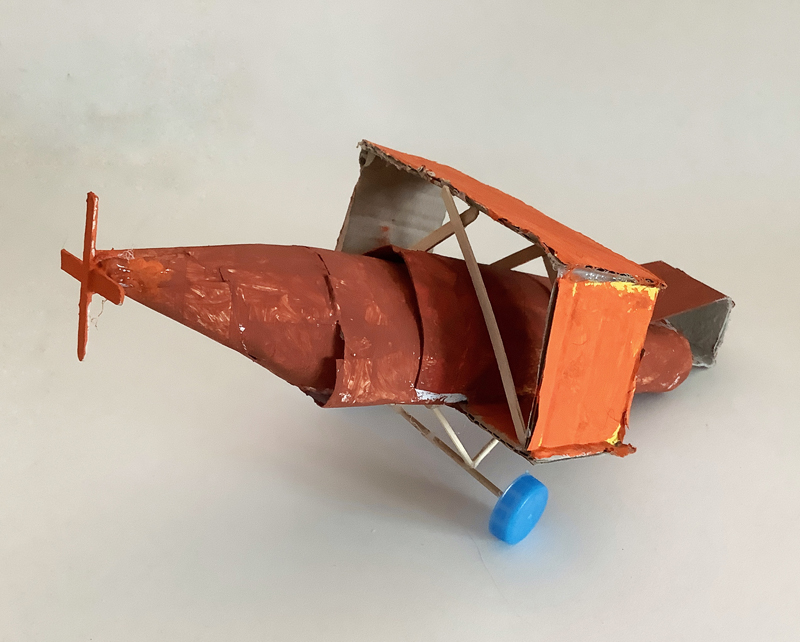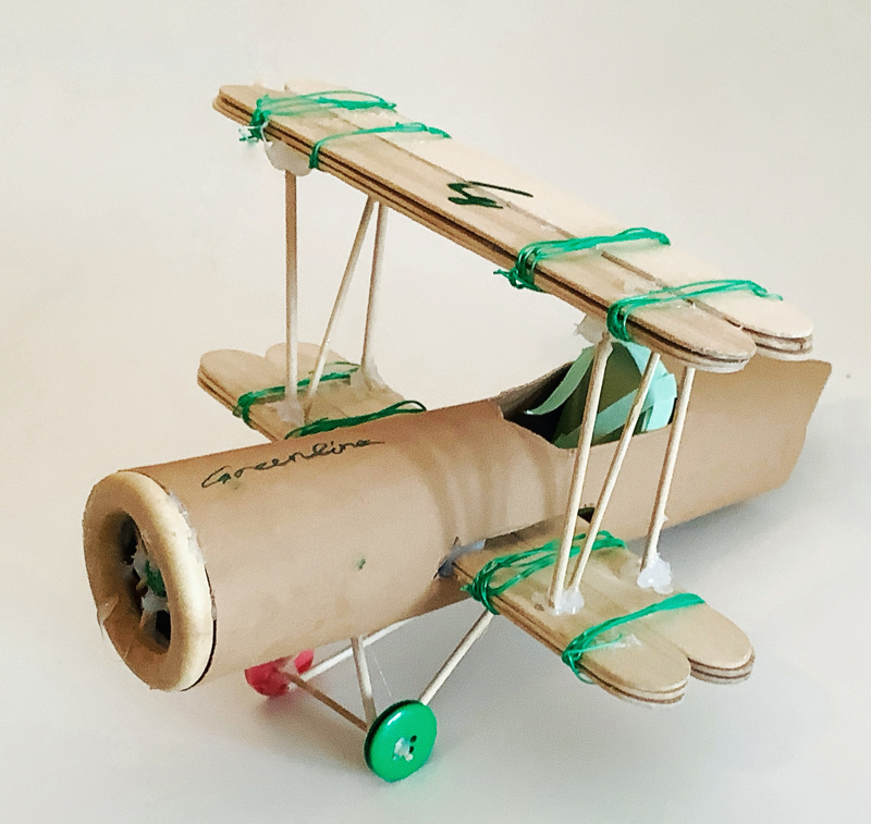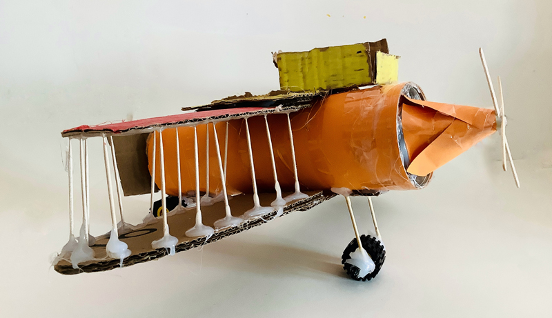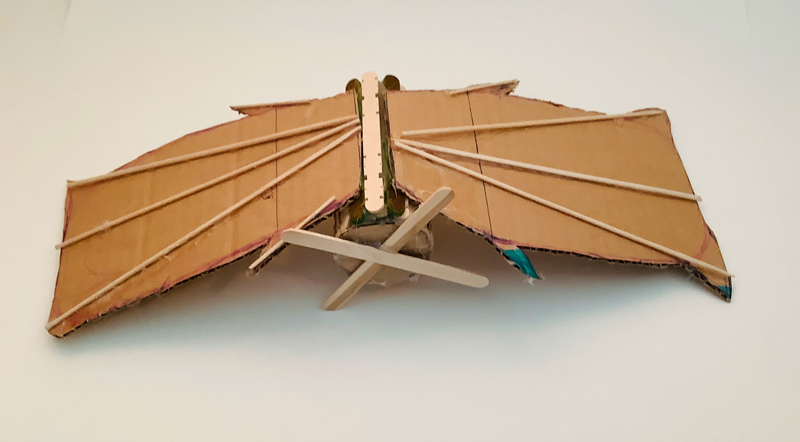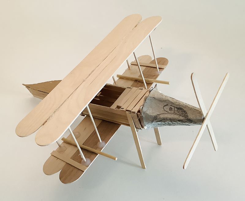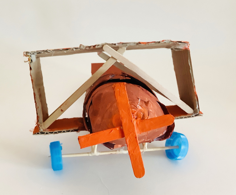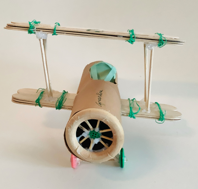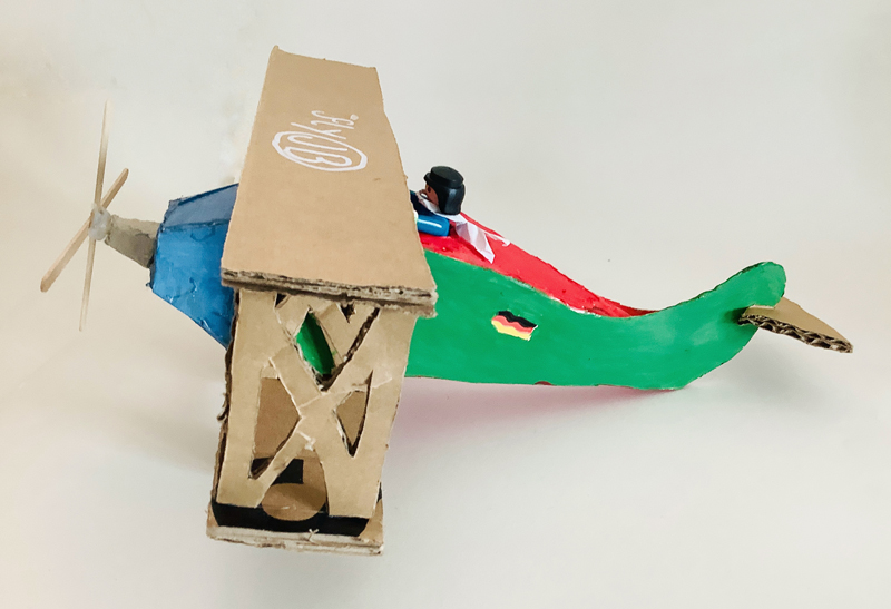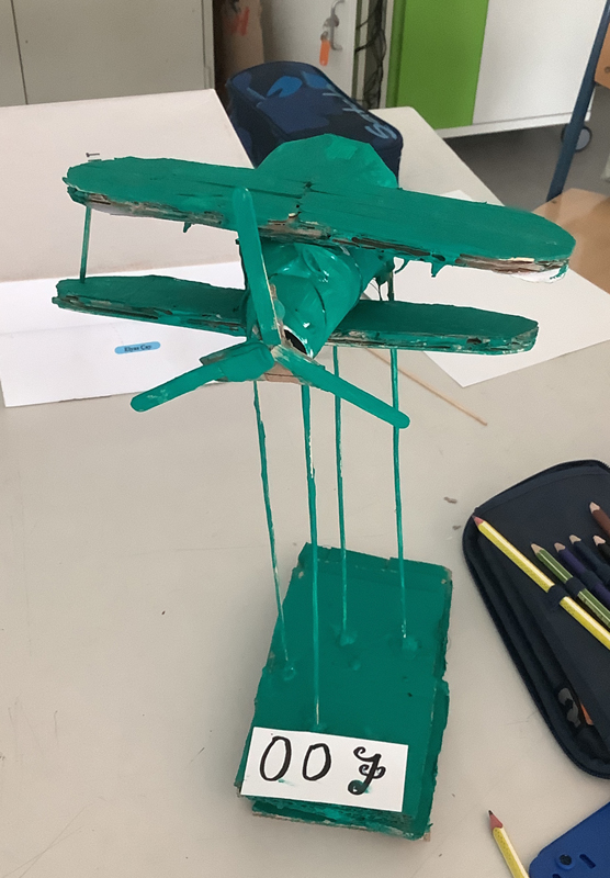 Die 5c baute altmodische Flugobjekte. Es sind sehr verschiedene Objekte entstanden, manche Objekte sehen aus wie alte Flugmaschinen und manche Schüler:innen nutzten ihre eigene Fantasie zum Gestalten.