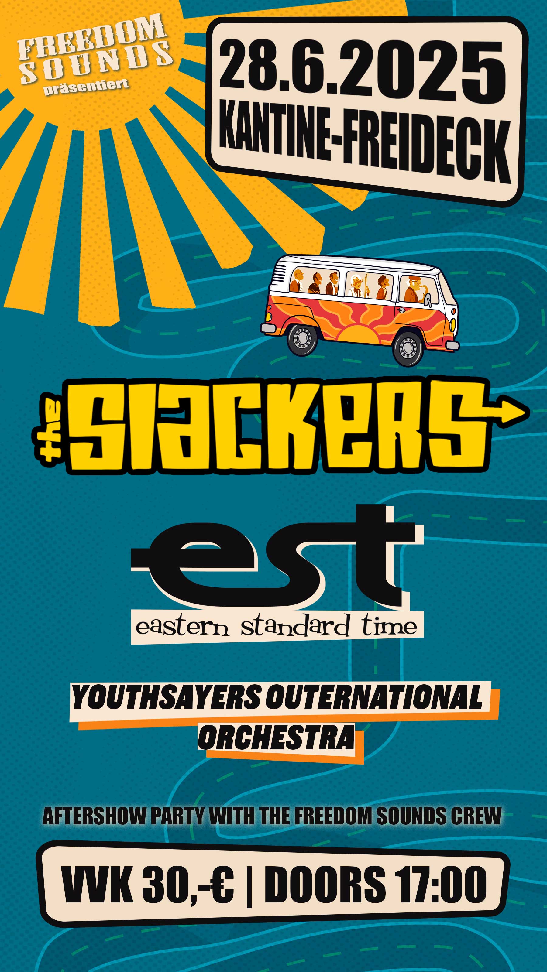 Einlass ist ab 17 Uhr, der Auftritt der Youthsayers ist für 17:30 Uhr - 18:10 Uhr geplant. Eastern Standard Time spielen ab 18:45 Uhr und The Slackers ab 20:15 Uhr.