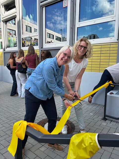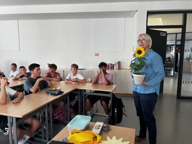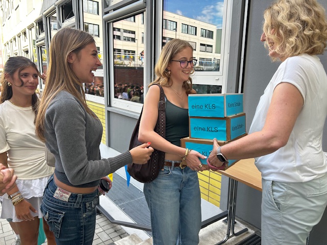 Frau Dr. Flink, die mit dem gesamten Kollegium auf alle Kinder und Jugendlichen gewartet hatte, schnappte sich das Mikro und lüftete das Geheimnis. Natürlich war dies ein besonderer erster Schultag, denn nach gut drei Jahren, ist Luises Altbau nun endlich instandgesetzt und das nach allen Vorgaben des Denkmalschutzes. Dies musste mit allen gefeiert werden. Gleich nach der feierlichen Ansprache schnitten die beiden Schulleiterinnen das gelbe Band zum Eingang des Altbaus durch. Jeder Klasse und jedem Kurs wurde eine hübsche dekorierte Schachtel überreicht, die stellvertretend die Klassensprecher:innen entgegennahmen. Schon ging es in die Klassen- und Kursräume des Altbaus und Neubaus. Auch hier wurden im Türrahmen gelbe Bänder durchgeschnitten, um dann in einer ausgedehnten Ordinariatsstunde auch die Geschenkschachtel auszupacken, die der Förderverein wie immer großzügig spendete. Neben Süßigkeiten gab es für alle einen KLS-Bleistift und ein Lesezeichen – zwei Werkzeuge, die im kommenden Schuljahr sicher häufig zum Einsatz kommen. Kaum war die Schachtel entdeckt, Luises Willkommensbrief gelesen, kamen auch schon die beiden Schulleiterinnen mit einer Sonnenblume im Blumentopf vorbei. Als KLS-Tradition bekommt jedes Kind zum Schulstart in die fünfte Klasse eine Sonnenblume, nun gilt es als Klassenchallenge, die Sonnenblume im Blumentopf so gut zu pflegen, um sie dann dem nachwachsenden Jahrgang zu vererben. Wir sind jetzt schon gespannt, wie groß die Sonnenblumen werden und ob sie sich vielleicht sogar vermehren.