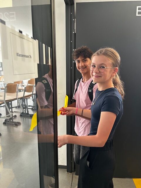 Wir haben eine KLS und die besteht aus vielen Schüler:innen, die ab diesem Schuljahr 2025/2026 erstmals in beiden Gebäuden unterrichtet werden. Also „Zwei Gebäude, eine KLS!“ und diese Einheit, haben unsere Schüler:innen mit einem Puzzle dargestellt, indem jede Klasse und jeder Kurs einen Teil der drei Großbuchstaben KLS mit ihren bunten und namentlich gezeichneten Sonnenblumen dekorierten. Am Ende des ersten Schultages wurden die Puzzleteile von den Schulleiterinnen und den Schüler:innen geduldig im Eingang des Altbaus zusammengefügt.